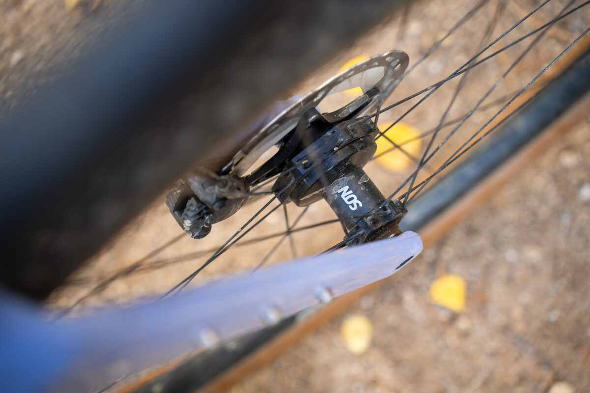 The SON 29 S front dynamo hub provides enough power to recharge the Lupine Smartcore at a rate of 12% an hour when riding about 13 mph (or 20 kph), and it can power both lights—without drawing on the battery—at a speed of ~9 mph (15 kph). Without consulting someone far better at math than I am, my intuitive worry is the system doesn’t offer enough power storage in the battery to be relied upon for more than running the front and rear lights, given that riding a loaded bike means more time spent riding at slower speeds. Perhaps internal downtube space was a limiting factor, but I wonder why Canyon didn’t opt for even a 5,000 mAh battery to ensure a little more margin when undertaking routes with a lot of vertical gain—and thus limited time for the dynamo to recharge the battery—or through remote terrain with little access to external power sources.