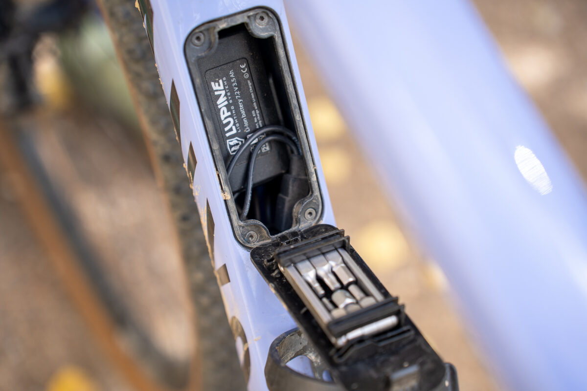 To achieve this, ECLIPS is built with some desirable upgrades: an included SON 29 S front dynamo hub—where connection terminals integrated into the front dropouts eliminate the need for an external wire—is connected to a Lupine Smartcore 3,500 mAh battery housed in the Grizl’s LOAD downtube storage compartment. The battery is then wired—internally, invisibly—to front and rear lights, a 1,000-lumen Lupine Nano SL that is secured to the Fully Mounty aero extension, and a 45-lumen Lupine C14 light integrated into the seatpost clamp (note that because blinking tail lights are not legal everywhere, this light blazes a solid red when on). At 20 kph (or about 13 mph) the battery recharges at a rate of 12% per hour, faster when the rider’s speed increases. Lastly, ECLIPS includes an input/output USB-C port on the steerer column’s non-driveside to top off the buffer battery between rides.