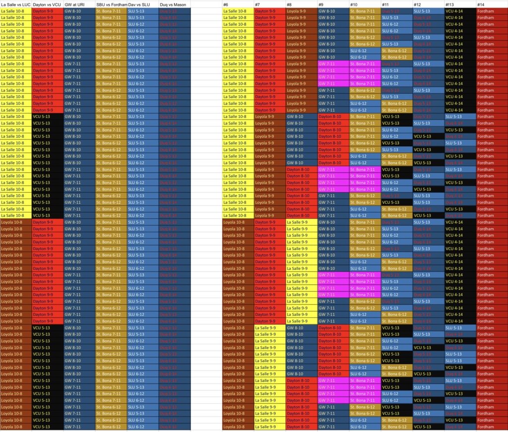 Clinches 13-seed with a loss to Davidson AND a Duquesne win over George Mason AND a VCU win over Dayton.
