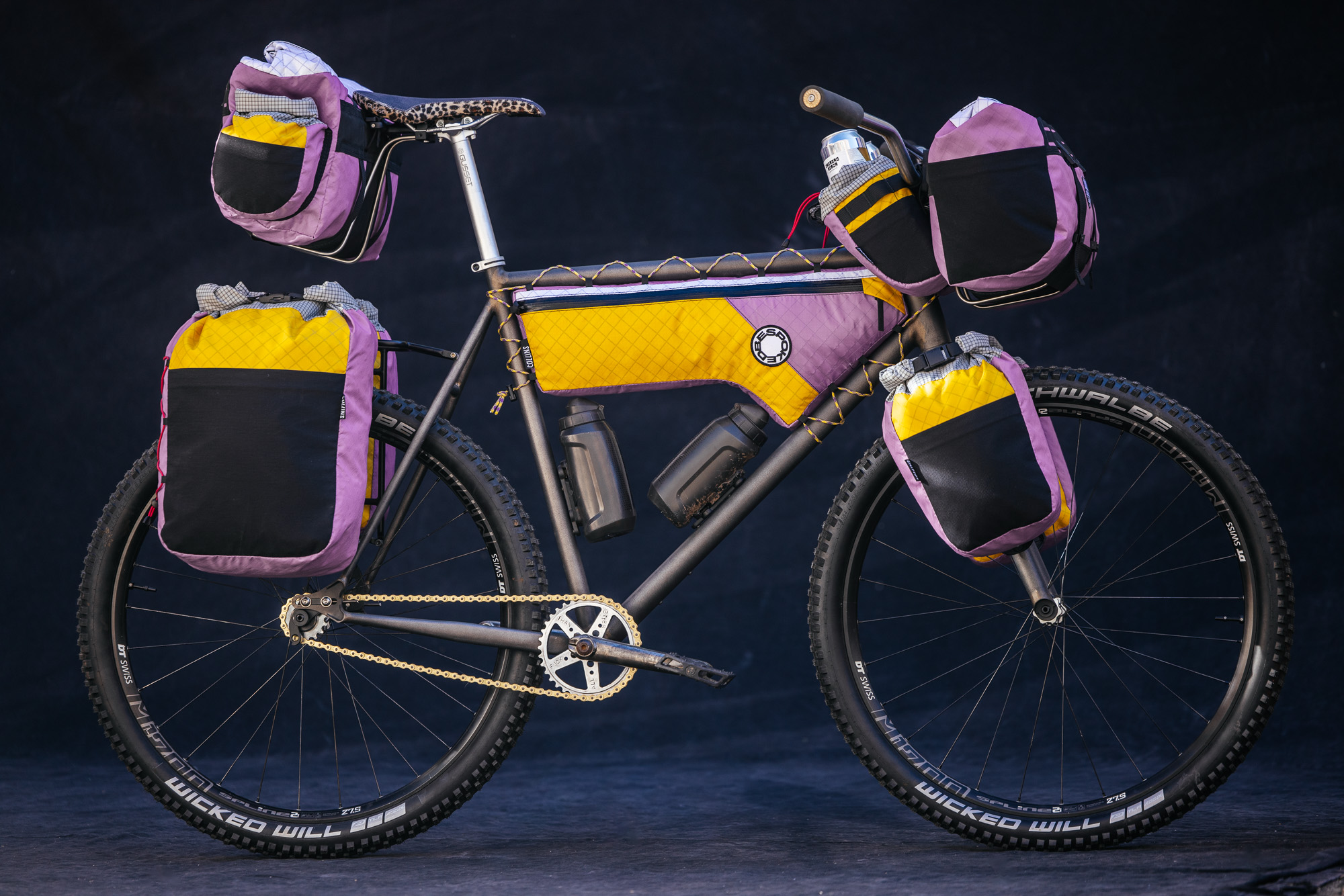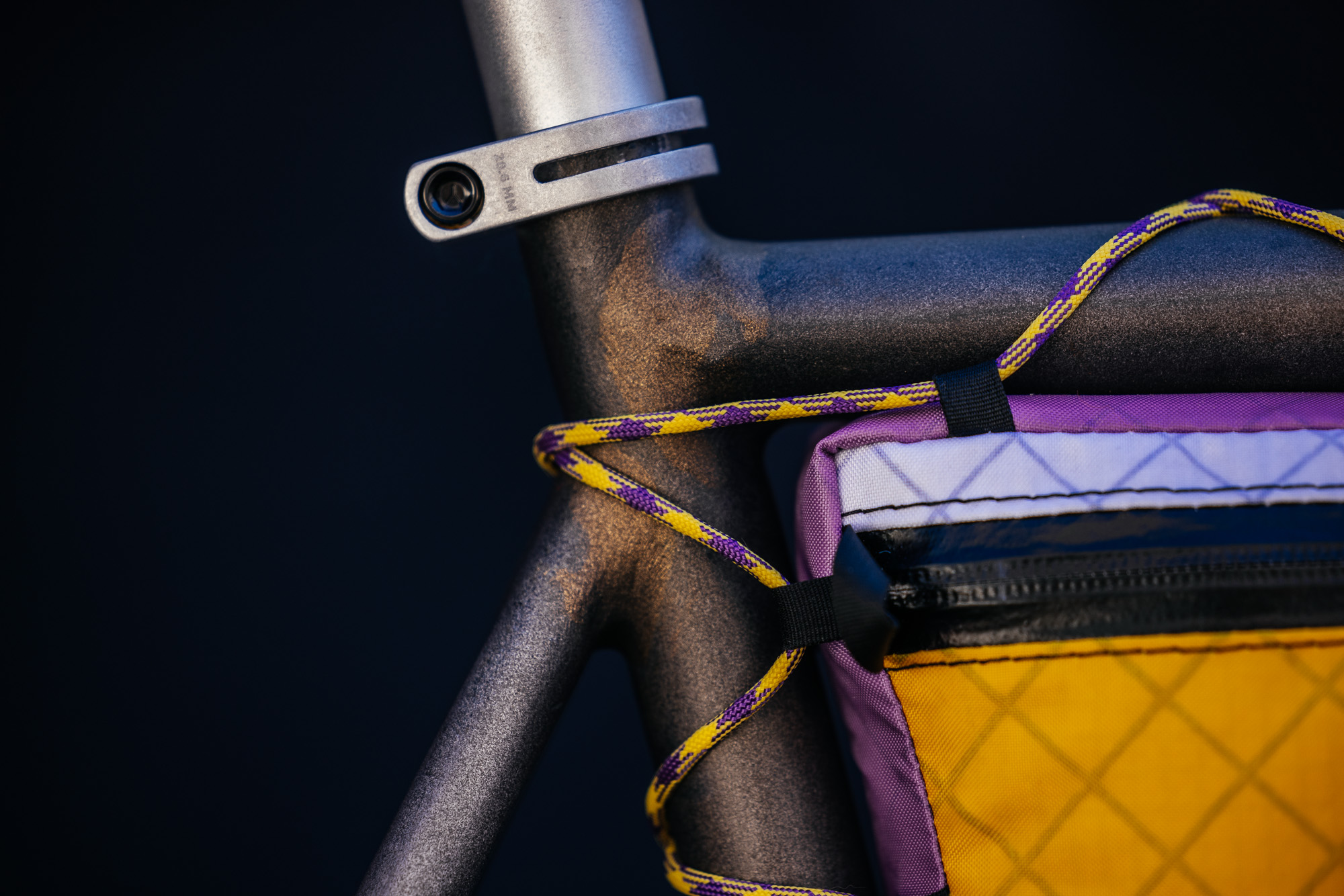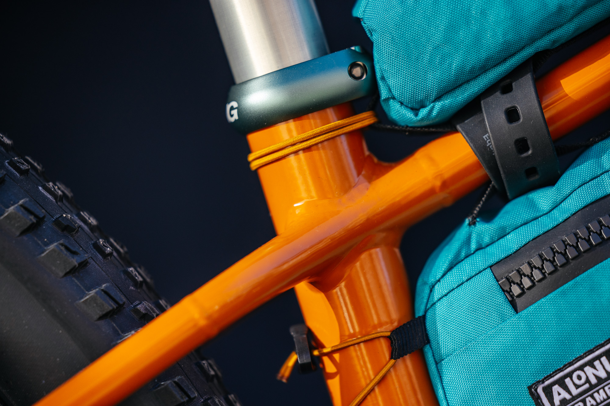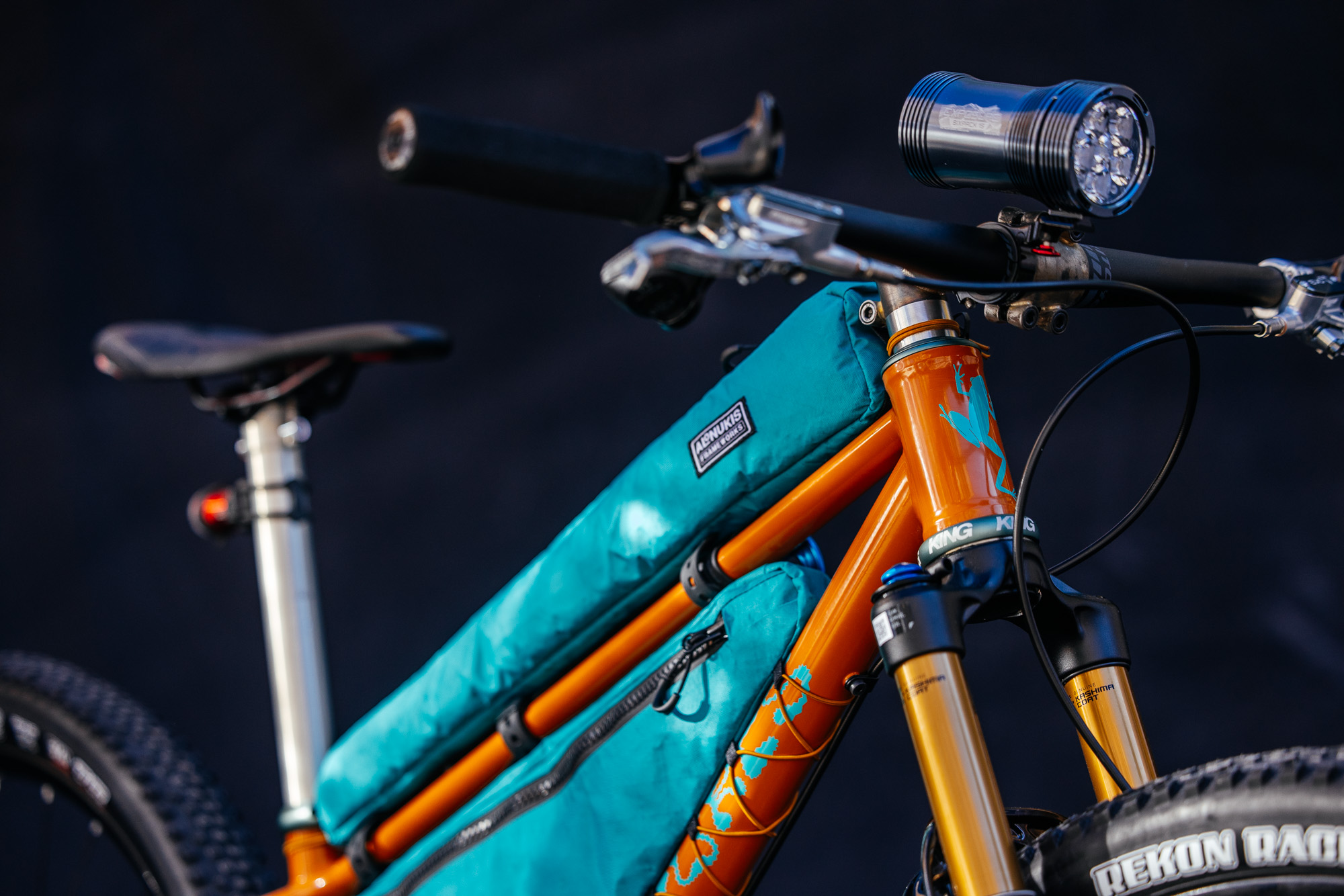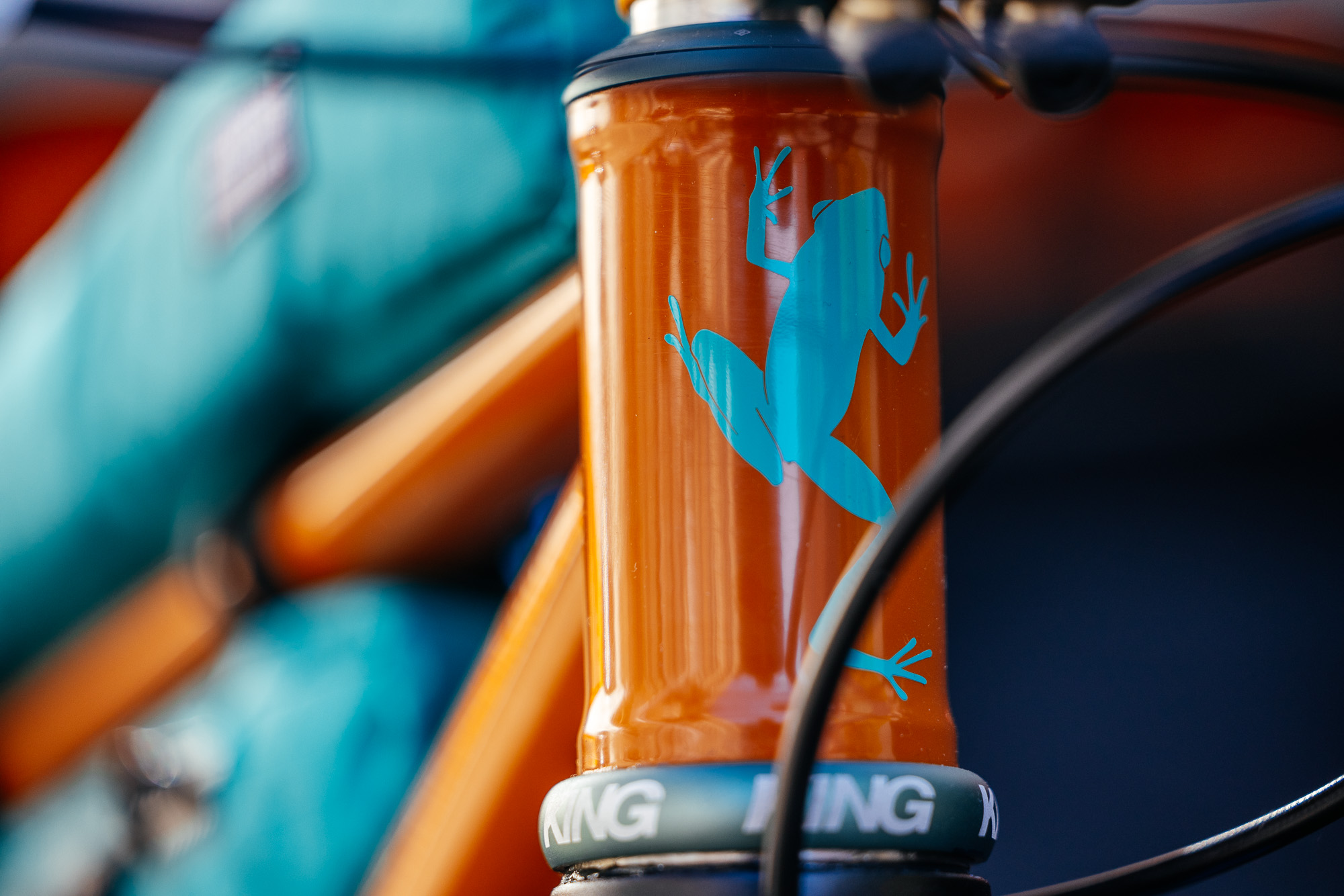 Adorning the head tube is a Dendrobates, a genus of Poison Dart Frogs, from which the bike’s colors are also inspired. The frame bags were also made by Johannes, a service he includes as an optional add-on for all his clients.