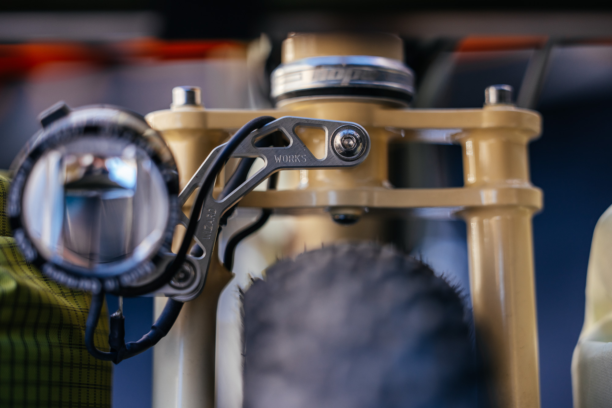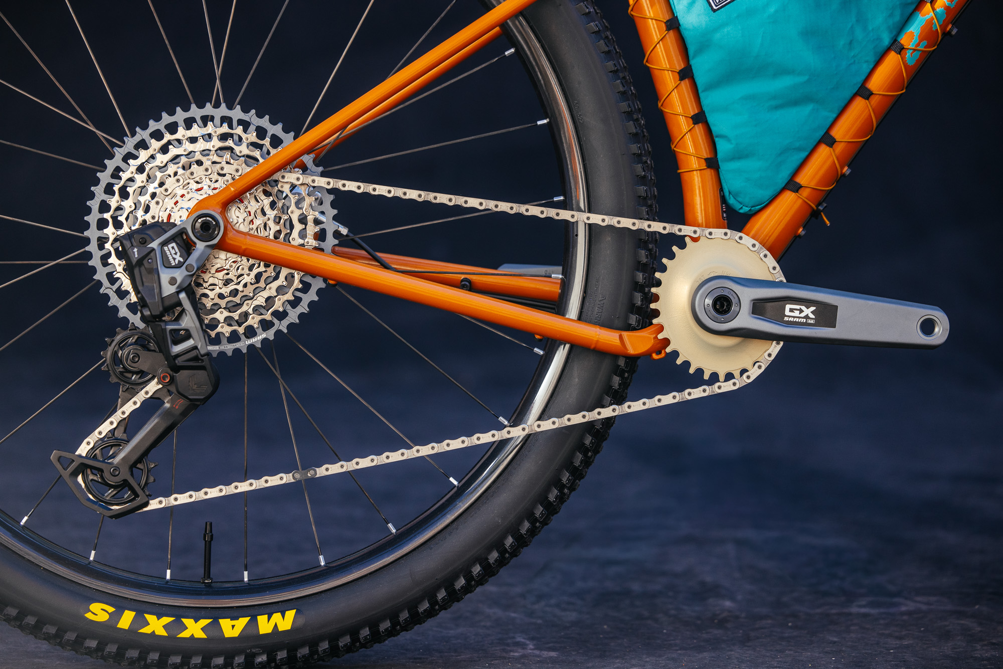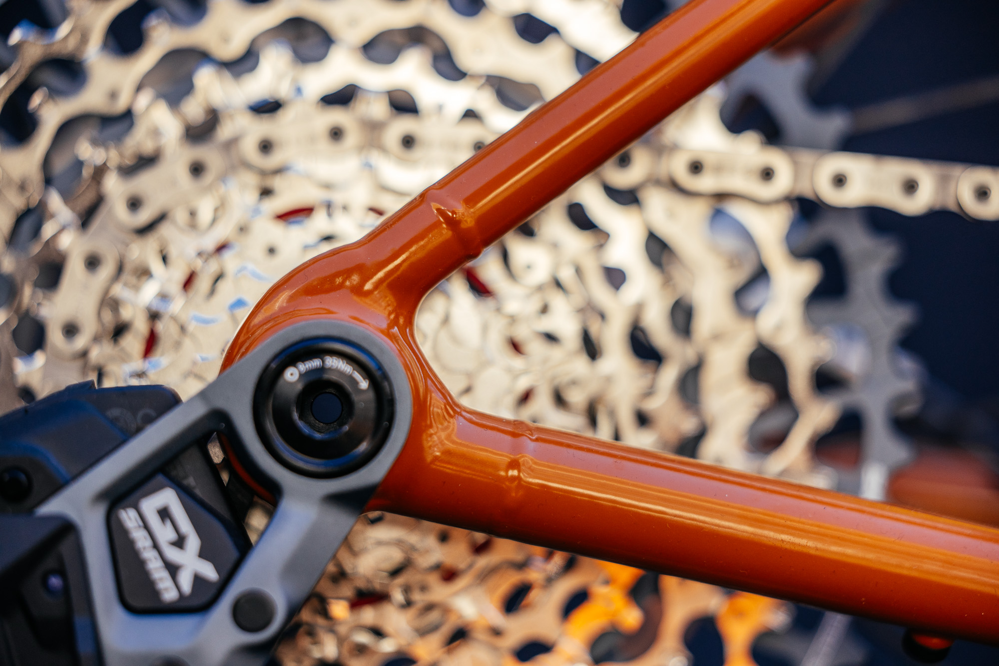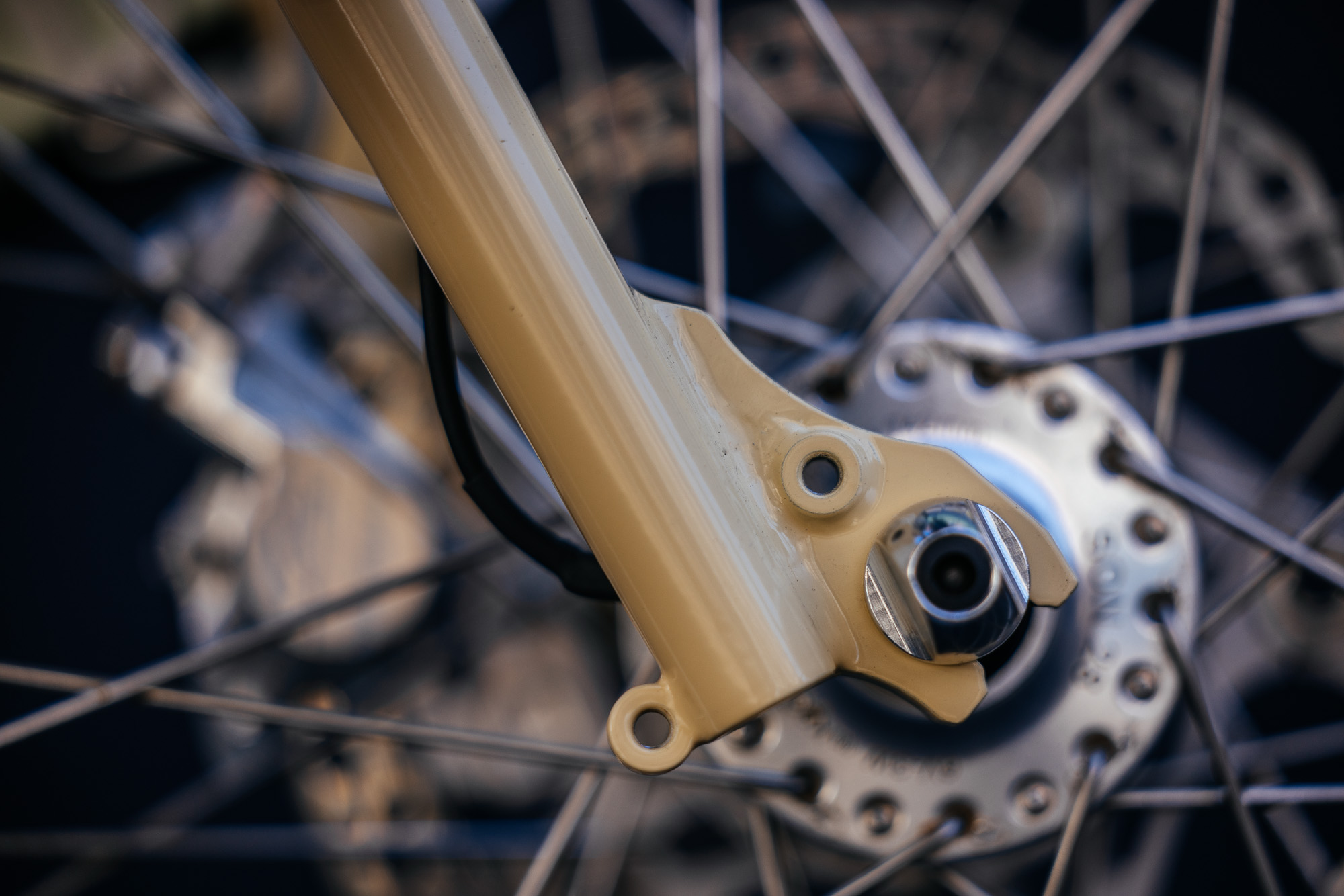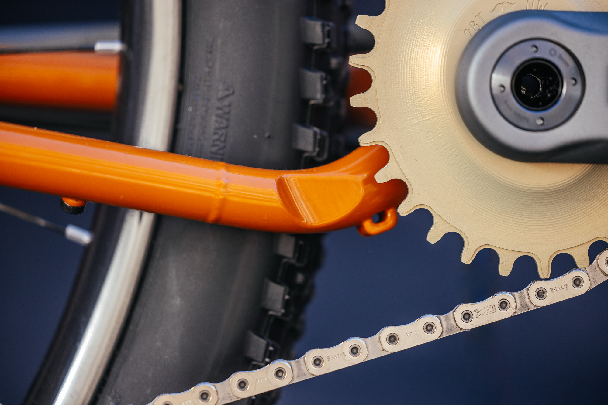 The Typhoon’s tire clearance is plentiful, with Schwalbe’s G-One Overland Pro taking center stage, offering low rolling resistence with higher volume comfort. First debuted at last year’s Bespoked UK, the UDH dropouts are now more refined. Offering machined precision done in house at the Belgium builder’s facilities.