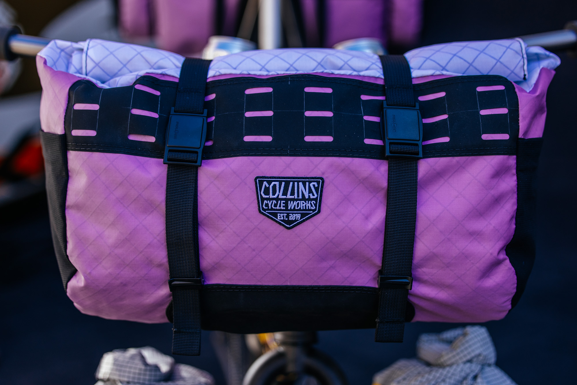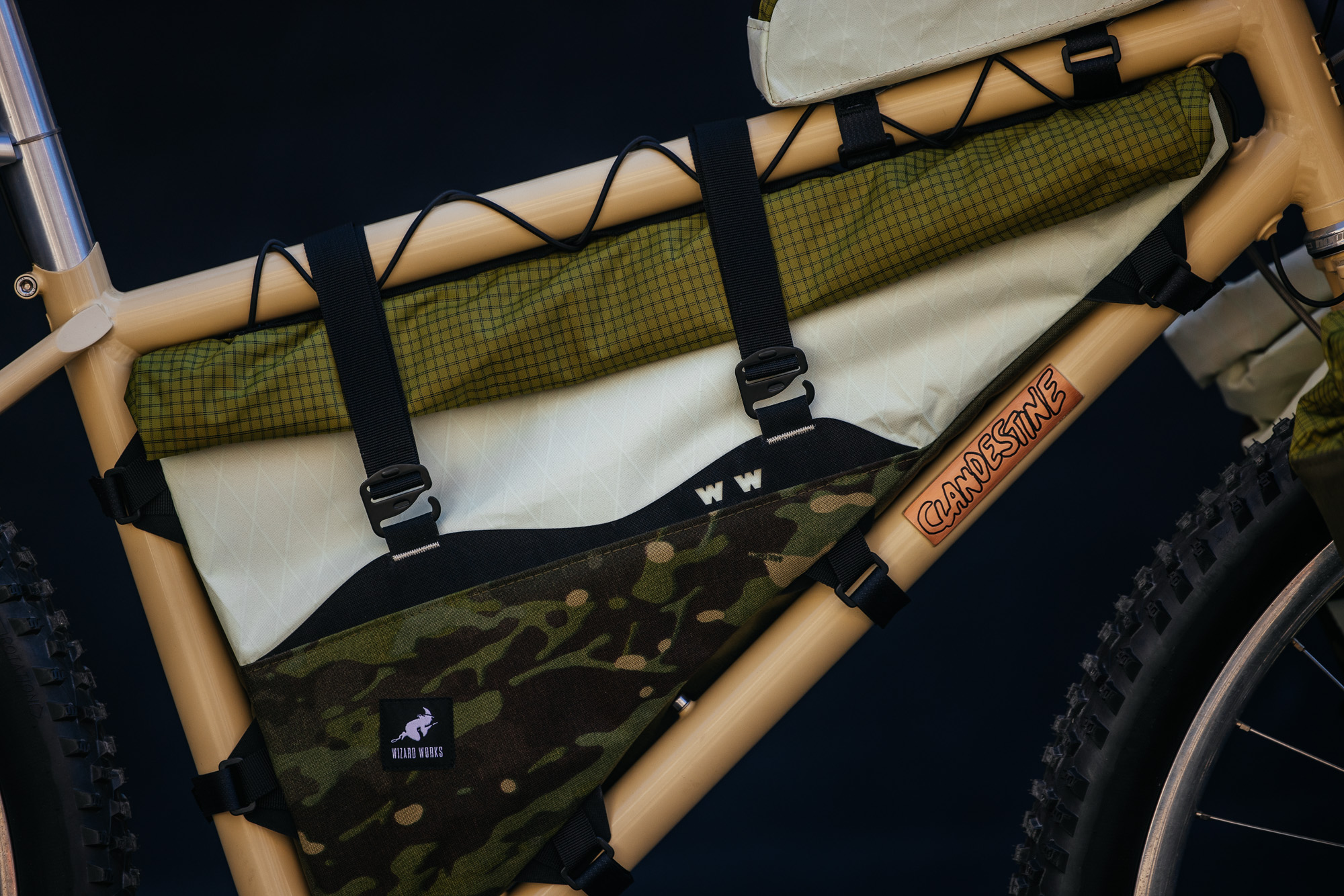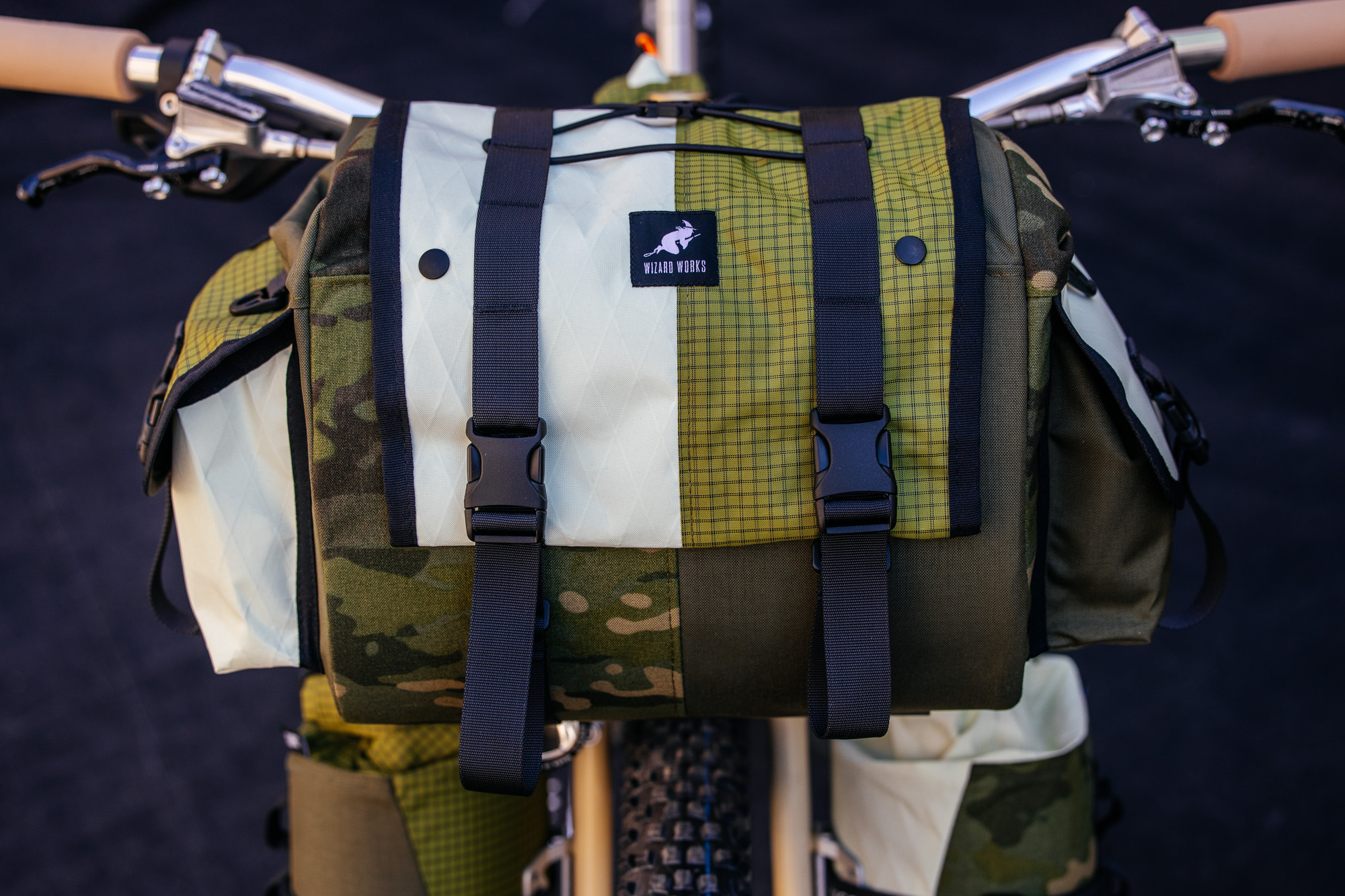 All of the bags on display are seam-sealed and waterproof, including the brand’s new roll-top frame bags, Badjelly bar bag, and Figwit cargo fork bags. Vee herself chose the colors and patterns of these bags. The jungle camo hits hard! And of course, the Clandestine Carrier is the perfect vessel to display this new portage.