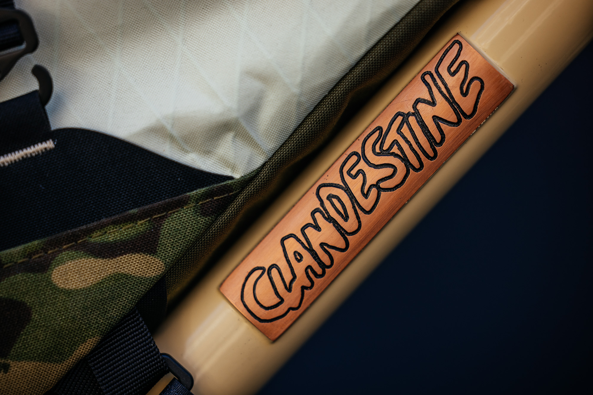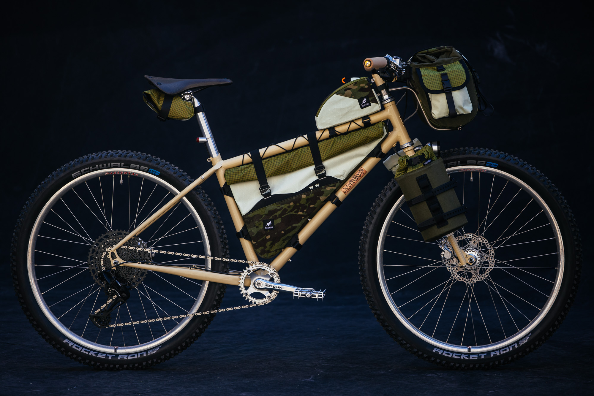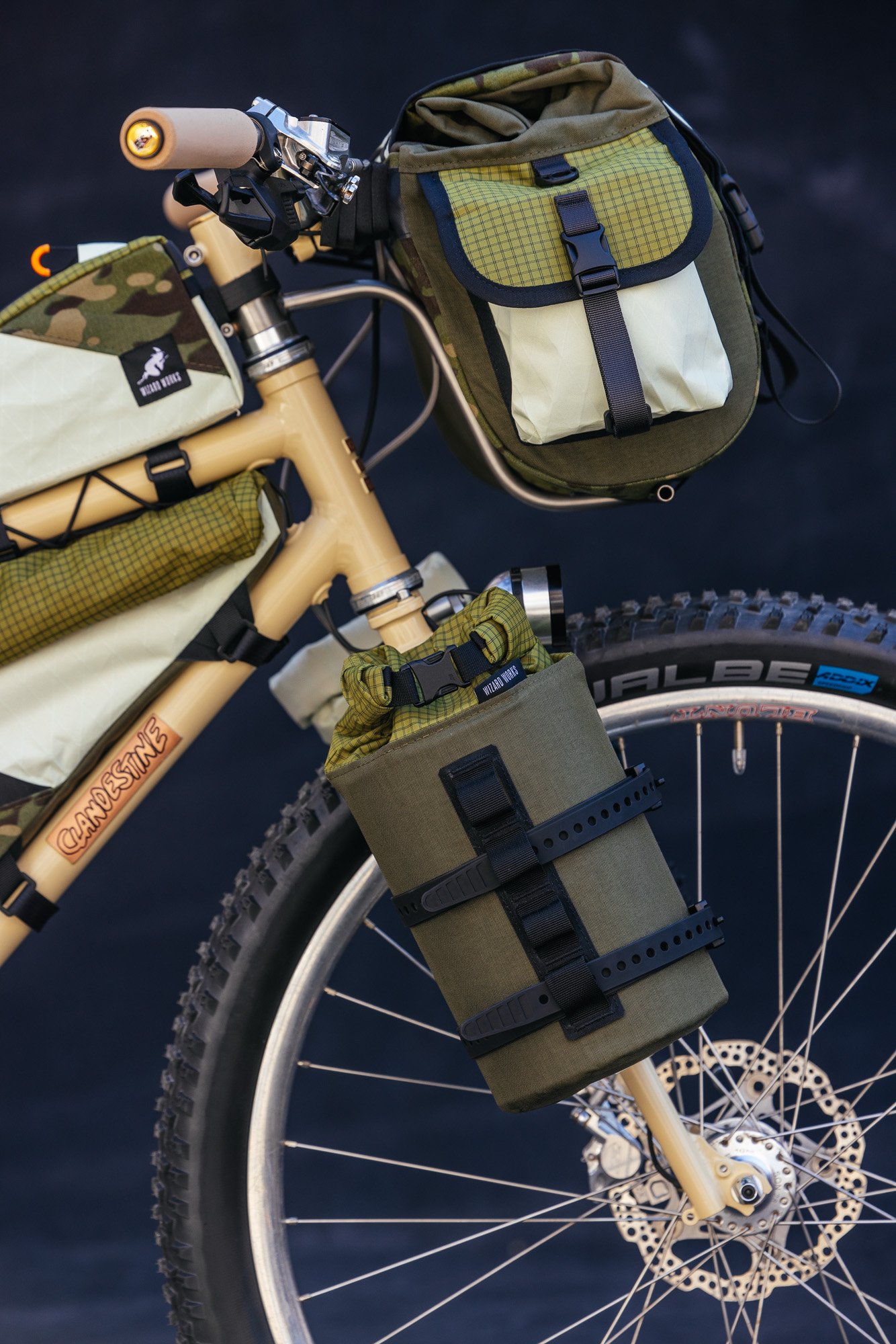 All of the bags on display are seam-sealed and waterproof, including the brand’s new roll-top frame bags, Badjelly bar bag, and Figwit cargo fork bags. Vee herself chose the colors and patterns of these bags. The jungle camo hits hard! And of course, the Clandestine Carrier is the perfect vessel to display this new portage.
