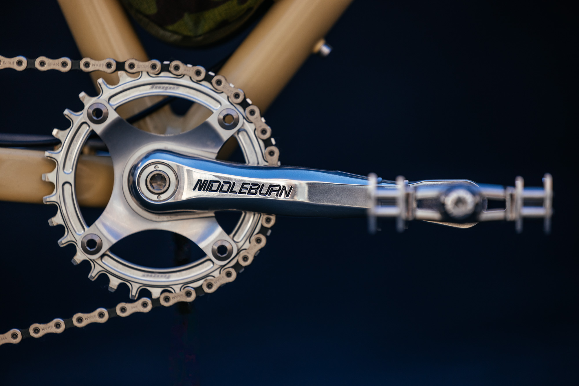 The desert tan Carrier frame is Vee’s personal bike, and it all began with a special wheelset she pulled off her Velo Orange frame. The wheels are quick-release and feature a SON front hub and a rear Paul 9-speed hub. Vee really wanted to keep the wheels since they were still in solid condition, and she had Pi from Clandestine literally make a frame around them.