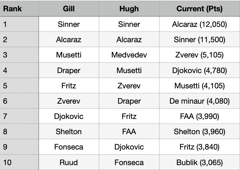 3 and 4: Who is going to be 3 is the biggest question for this exercise. I think Draper is the best choice if healthy from Feb Davis cup — which is his new projected return date — but the scope of this injury, with the repeated setbacks (he was initially due back at the US Open) is concerning and I hope he proves me wrong. Of course the biggest difference between Gill’s and my prediction is with Meddy. I am still high on Musetti staying up there this year, but I went with Medvedev over Musetti and everyone else for a couple of reasons: (a) the serve stats are trending back in a positive direction for the Russian. At his best the serve was a major weapon, and his serve in Brisbane was firing again (up at an 8.6, well above his 2025 8.2 rating); (b) the forehand started to get better post-US Open last year. The last two seasons it seemed like he tried to become more of an aggressive baseliner, and tinkered a lot with racquet and string changes looking for more power. But he’s never going to be a baseliner slugger, and he lost his consistency (down ~2% in make-% off both wings compared to 2023) and confidence as a result. More recently he seems to have rediscovered his counterpunching discipline, but he has added aggression to his bow in the form of net sneaks, especially off his backhand. He did it at the tail end of last year, and he showed it in Brisbane again, sneaking in off that line-faded backhand; (c) the new coaching staff. Fresh ideas. No scar tissue. Early success (two titles: Almaty, Brisbane). The “vibes” are probably better than they’ve been for some time; and (d) the tour structure rewards hard court specialists more than clay court specialists. It’s why he has 22 titles in 22 different cities. Medvedev’s best surface is littered with slams/1000s throughout the year. There’s six hard court Masters 1000s from March to November (seven if you count the ATP Finals on indoor hard as a 1000-ish event), and in recent years the Canada/Cincy double is the most easily “vultured” 1000 from Sincaraz, as they tend to skip Canada (case in point: Popyrin/Shelton). I think Musetti has to fire in April and May — Monte Carlo, Madrid, Rome, and Roland Garros — if he is to secure the third rank. He did very well on clay in 2025, but Sinner was absent for that stretch as well. While Musetti has improved on hard courts, he only has one quarterfinal to his name at slams (US Open 2025) or 1000s (Paris 2022), and no hard court titles at any level. I think his backhand defensive strategy is exposed too well by serve-plus-forehand players on hard, and more than ever this is an era of instinctive, pull-the-trigger, plus-one tennis. For this reason I gave the edge to Medvedev. His low and flat ball is harder/trickier to counter on hard, and while his defensive capabilities have declined, he’s still more difficult to hit through on acrylic than 99% of the tour. He’s been to the top, and he’s going to show that he’s still the best of the rest when at his best.