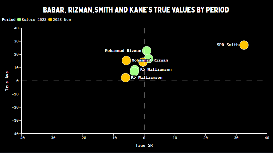 He went from being this middling anchor to massively improving on both true strike rate and average. That is mostly because of his BBL exploits, but he also had a great time in the MLC in 2024. It’s commendable, because he has also been superb in Tests since his hundred against India at the Gabba. On the other hand, Kane Williamson, Rizwan and Babar are still scoring at below par rates.