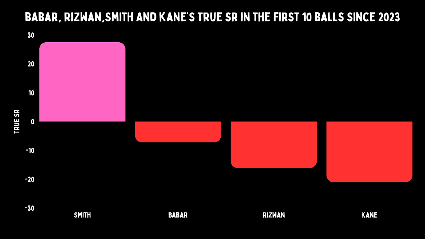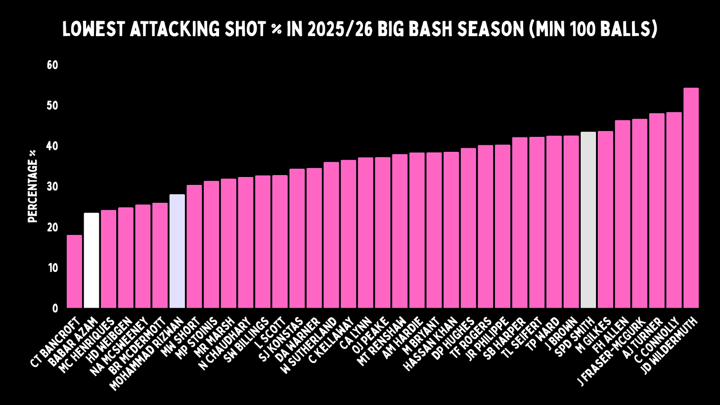There are two ways to really illustrate the difference between Smith and the others. In this BBL, Babar had the second-lowest attacking shot percentage, while Rizwan also made the bottom ten with ease. Their neighbours were Cameron Bancroft and Nathan McSweeney. Smith was on the other end of the graph, closer to Finn Allen and Jake Fraser-McGurk maverick territory.