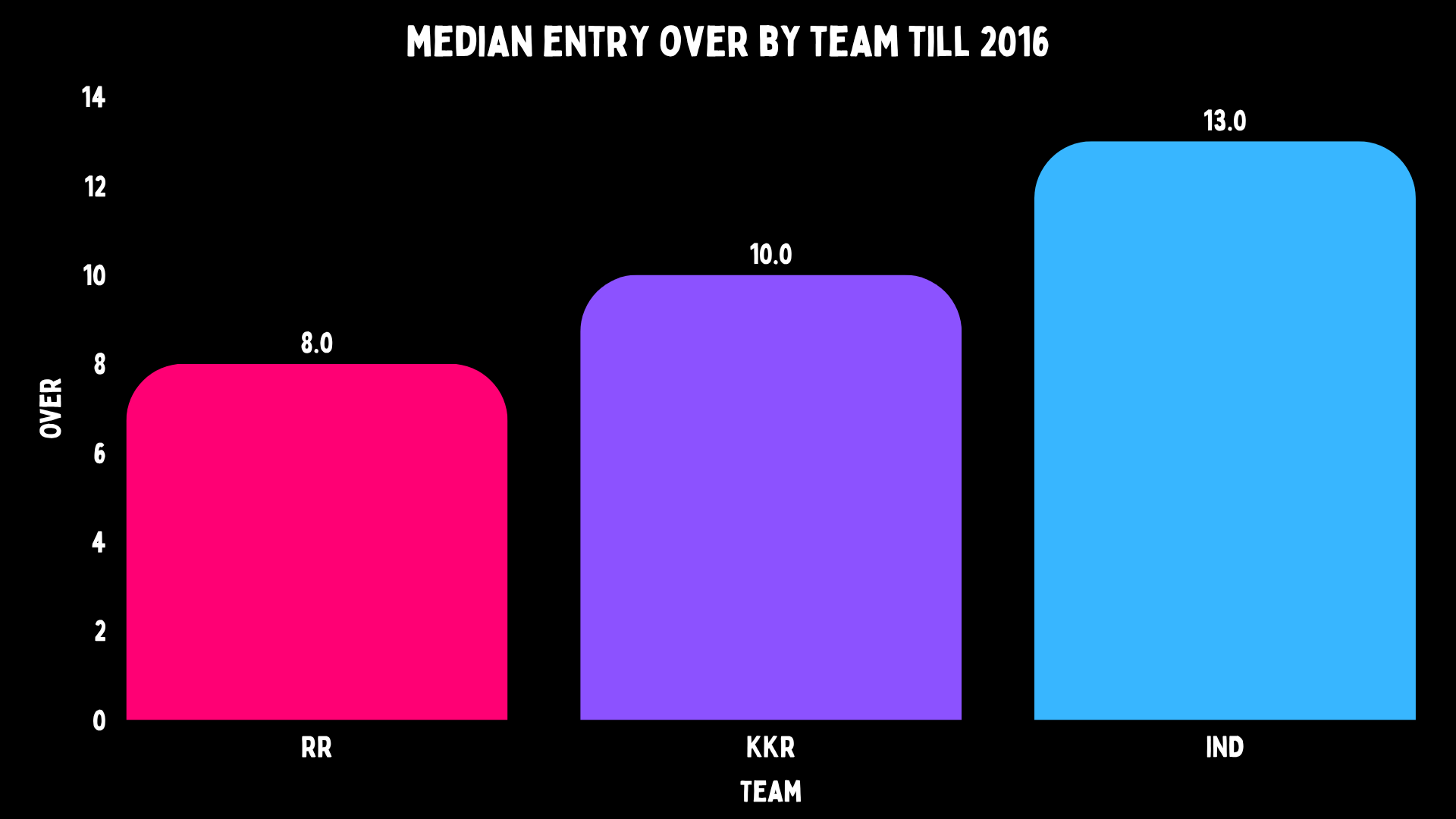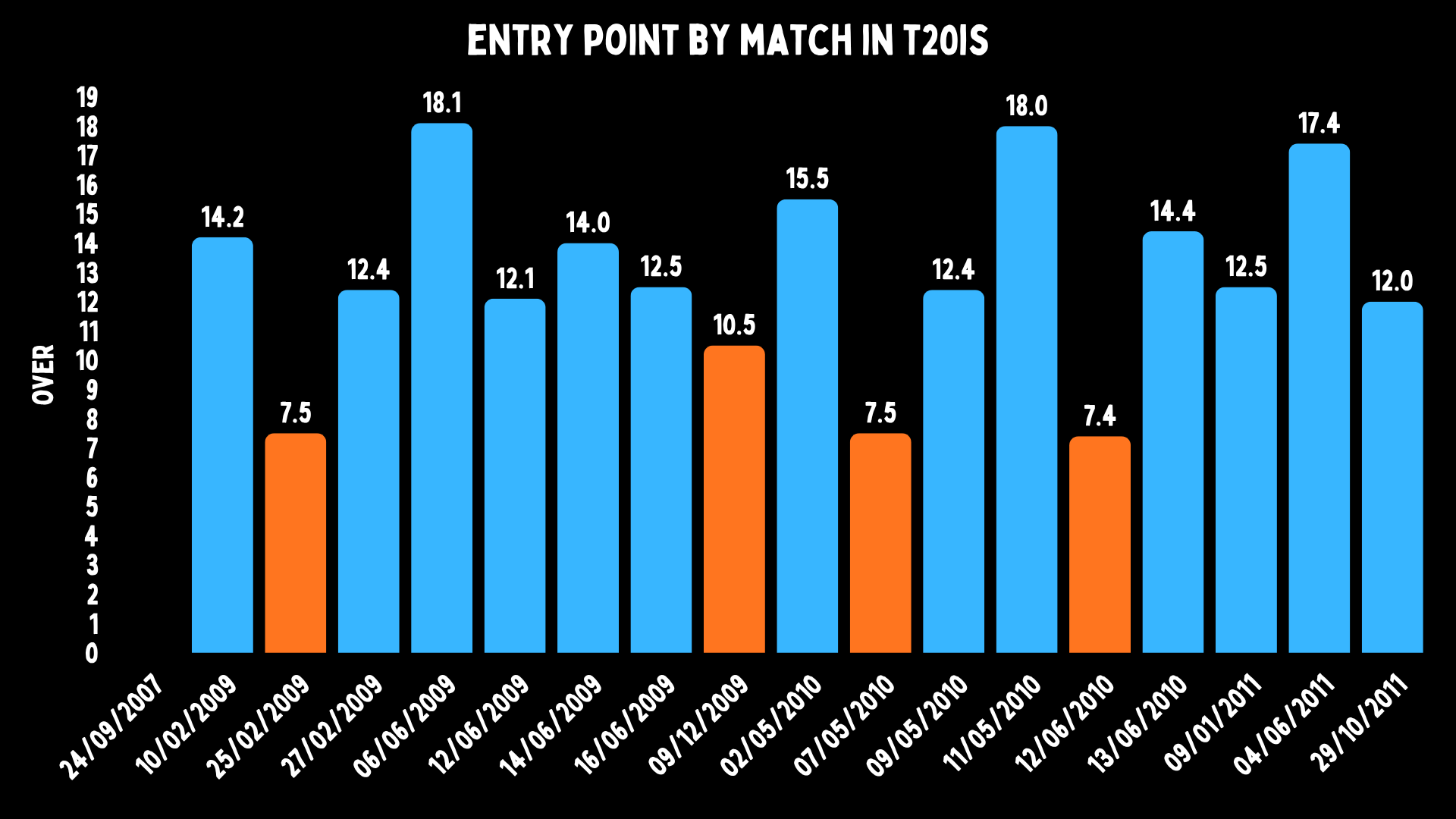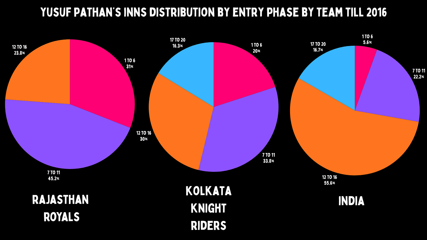 Yusuf’s median entry point was in the 8th over for Rajasthan, the 10th over for Kolkata and the 13th over for India.