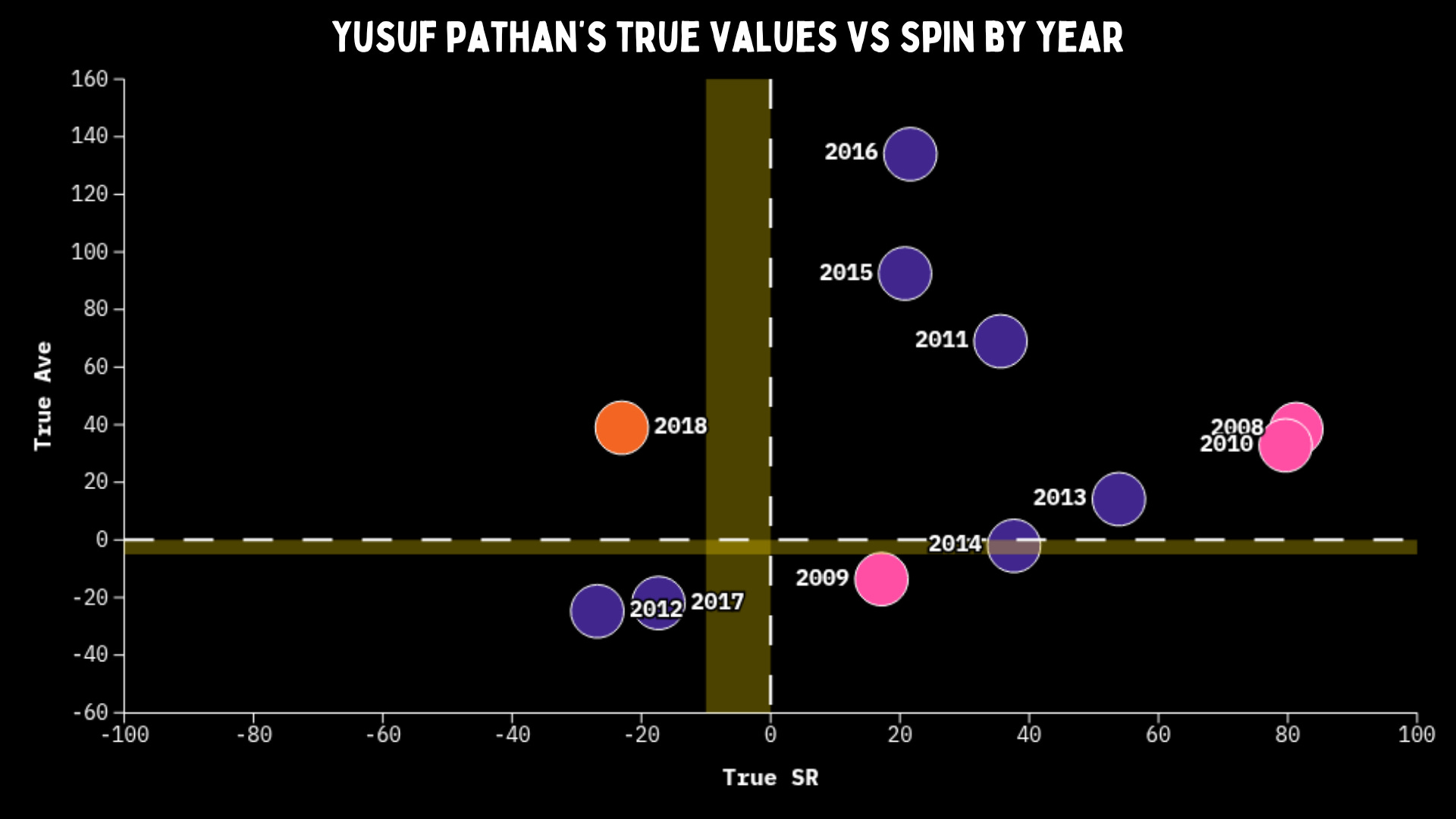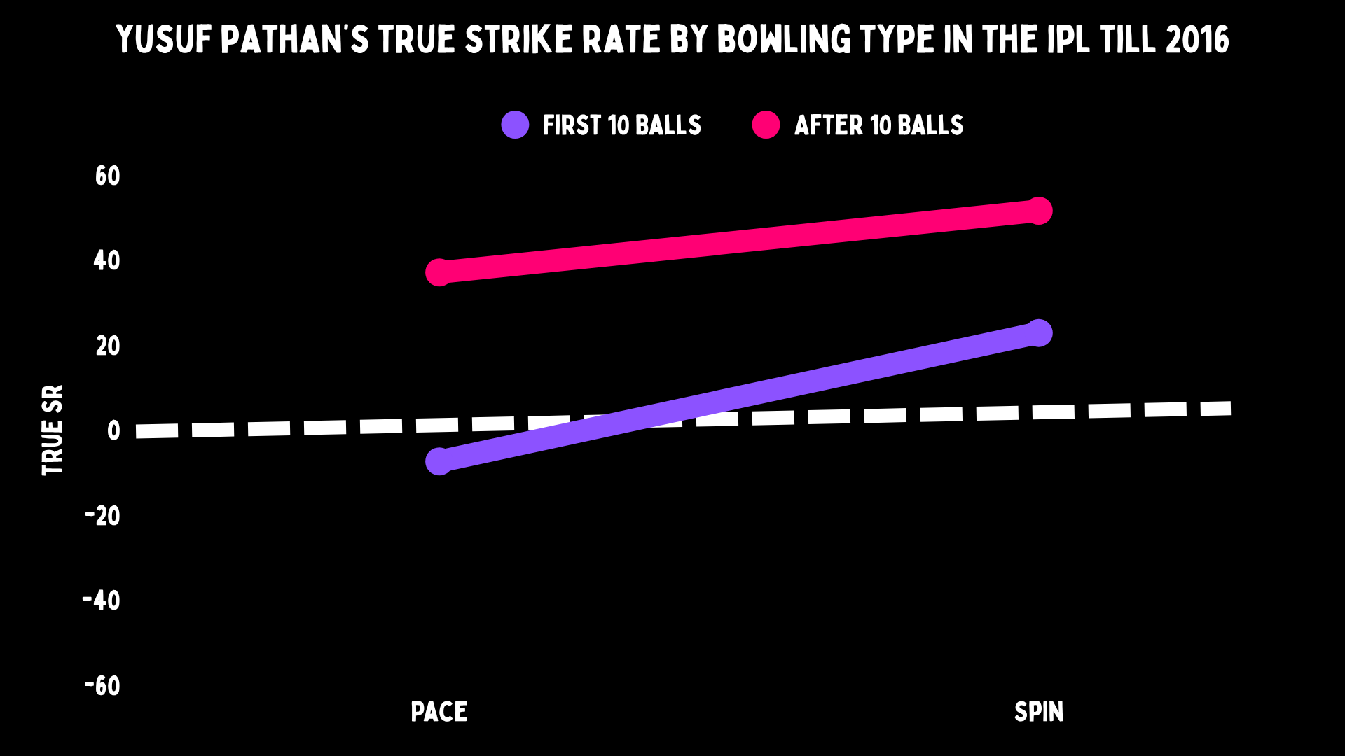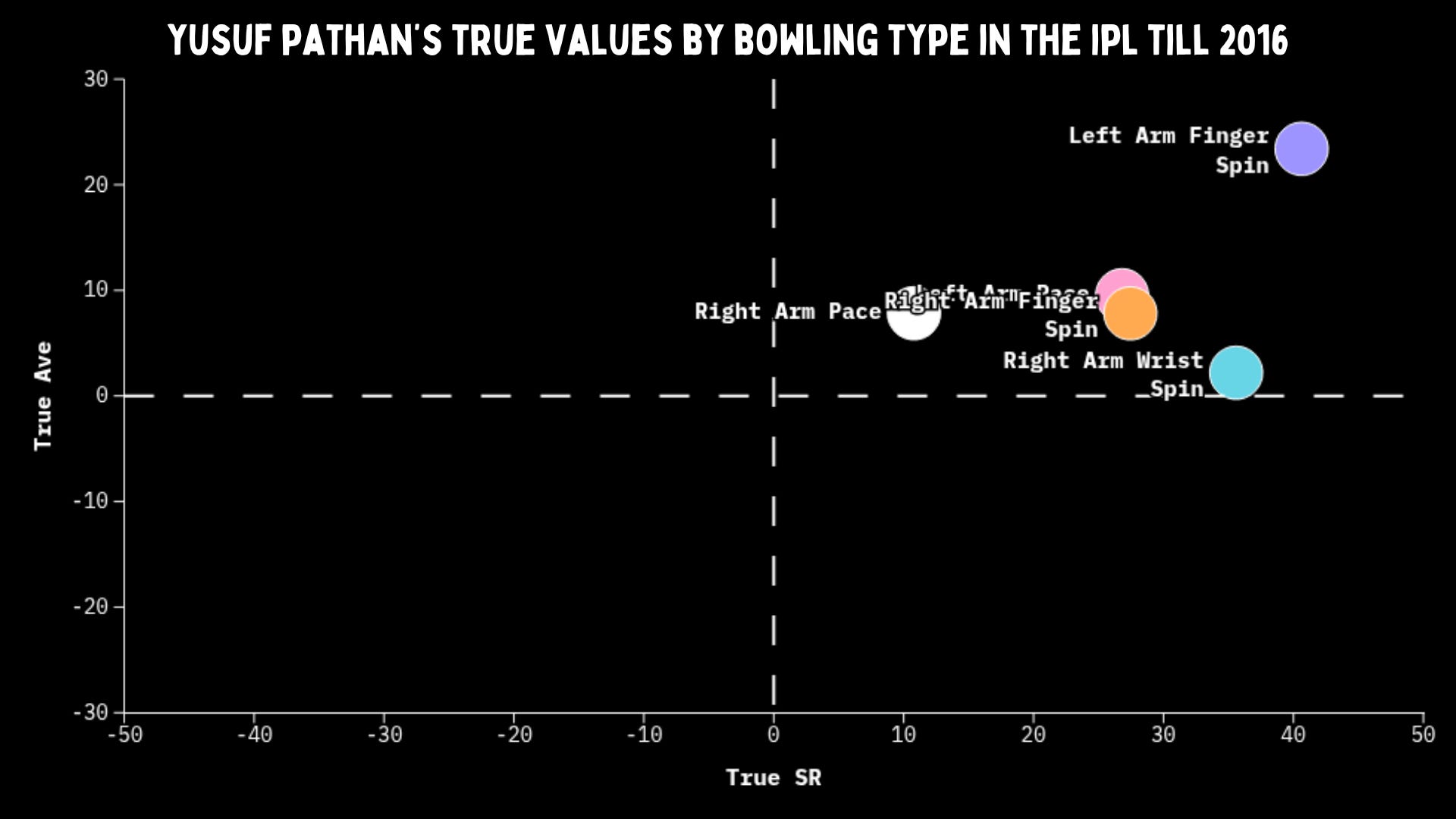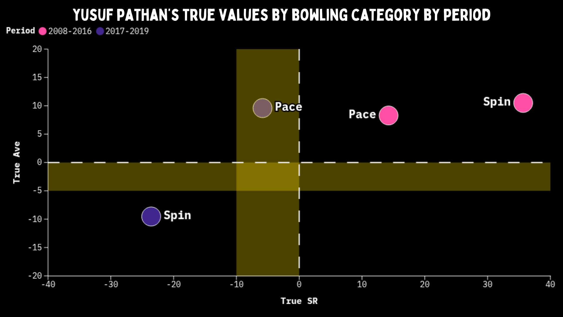 And once he’s set, that true strike rate jumps up to 51. Smashing spin from the get-go and crushing their soul when he’s set. However, Yusuf didn’t always like starting versus pace, he had a true strike rate of -7 in the first 10 balls. And that jumps to 37 when he’s set. He was a weapon; dangerous in the right hands, but could blow up in your face if you didn’t use him properly.