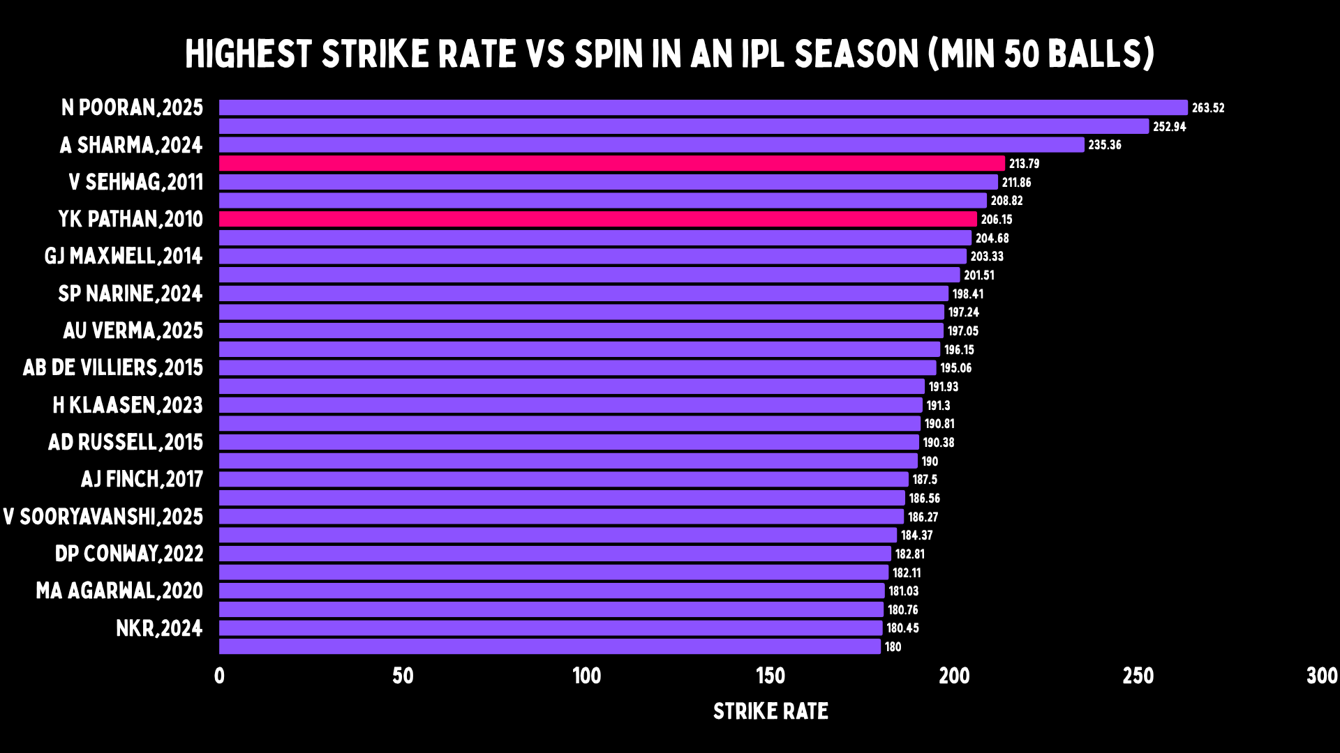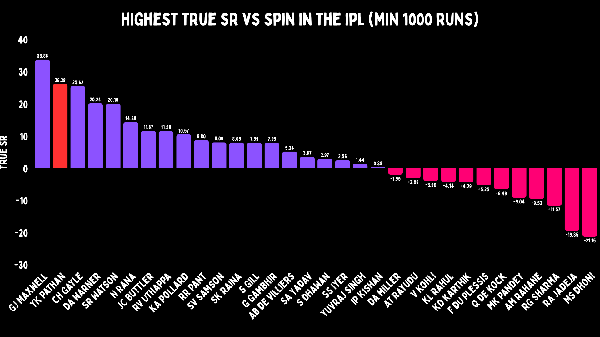For a minimum of 1000 runs, Yusuf has the second-highest true strike rate versus spin in the IPL. Only behind Glenn Maxwell with 34, and ahead of Chris Gayle, David Warner and Shane Watson.