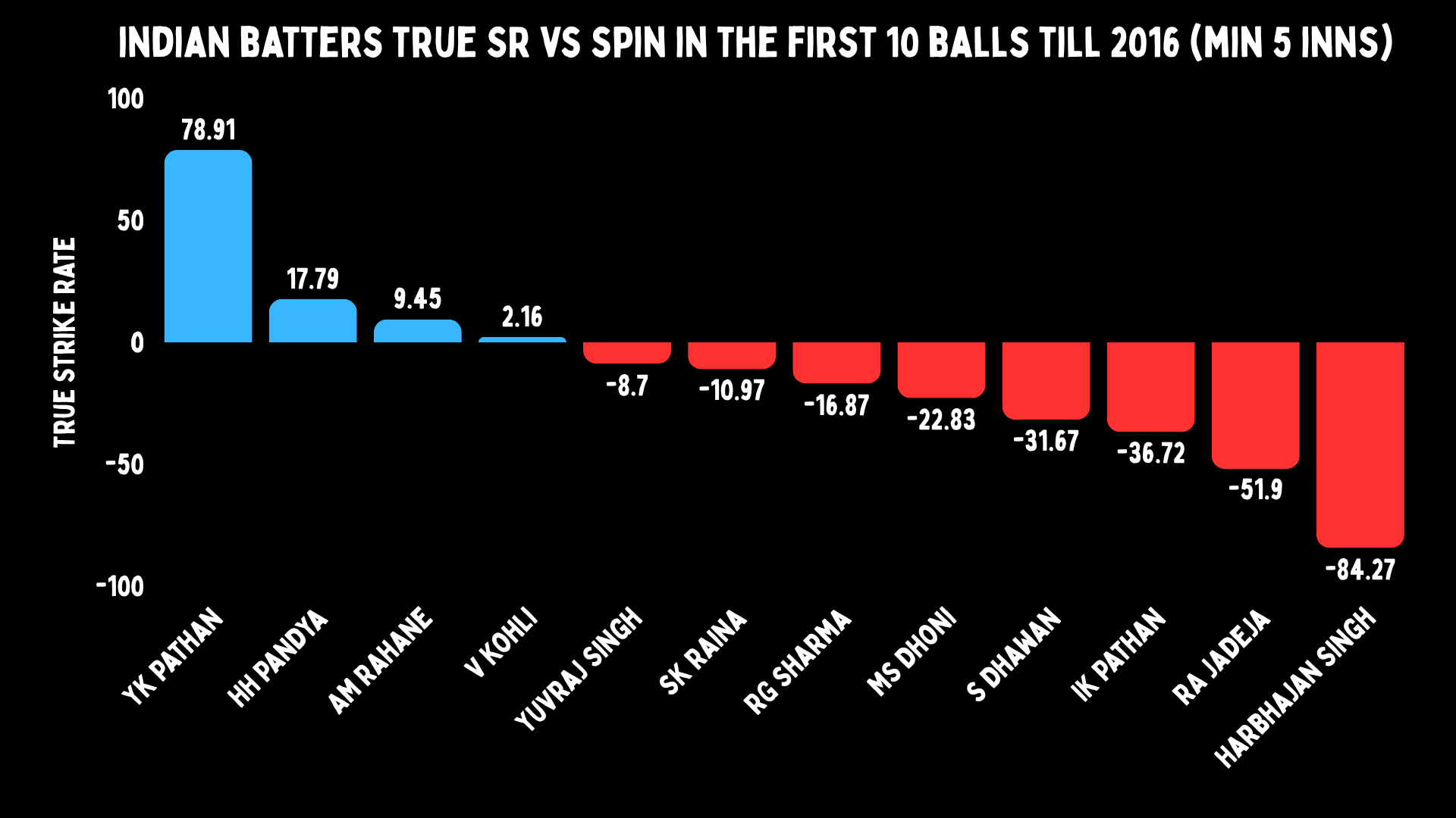 Yusuf’s true strike rate versus the turning ball is 36 till 2016 and -24 afterwards. That’s a 60 point swing in true strike rate. He had a small drop in his pace batting. But it was normal.