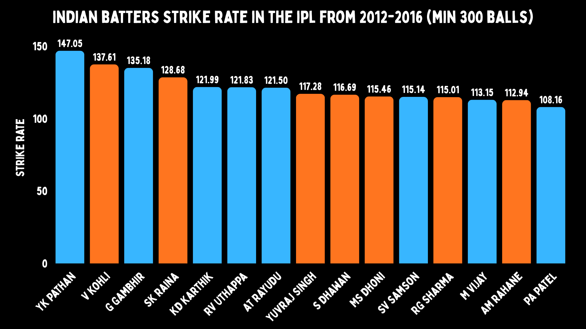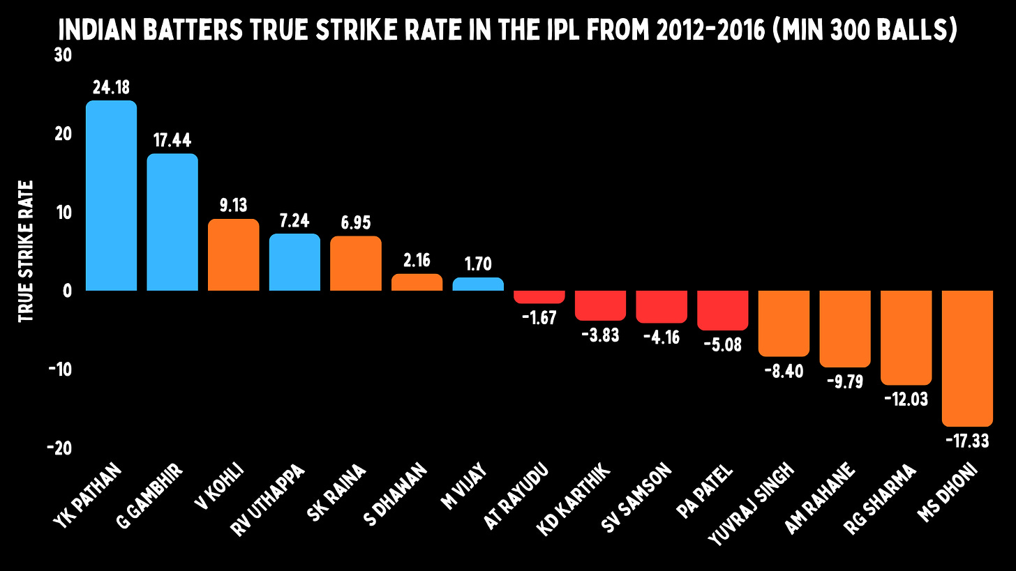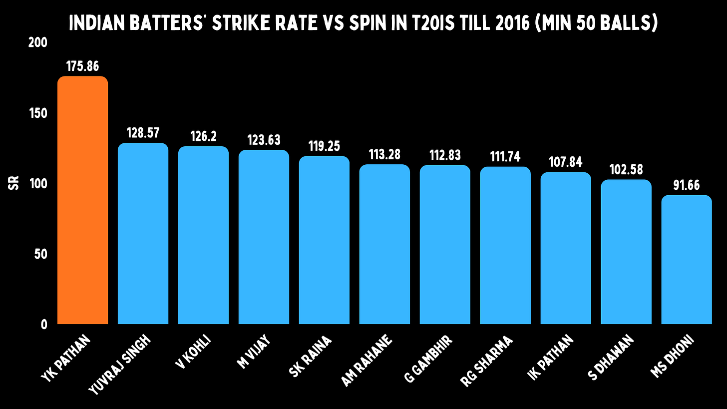 And yet even in the wrong role, the T20I numbers tell you exactly what India were leaving on the table. If we look at Indian batters versus spin till 2016, Yusuf had a strike rate of 175. The next highest was Yuvraj Singh at 129. MS Dhoni had a strike rate of 91. So Yusuf is 45 points ahead of the next-best player, and nearly double his skipper.