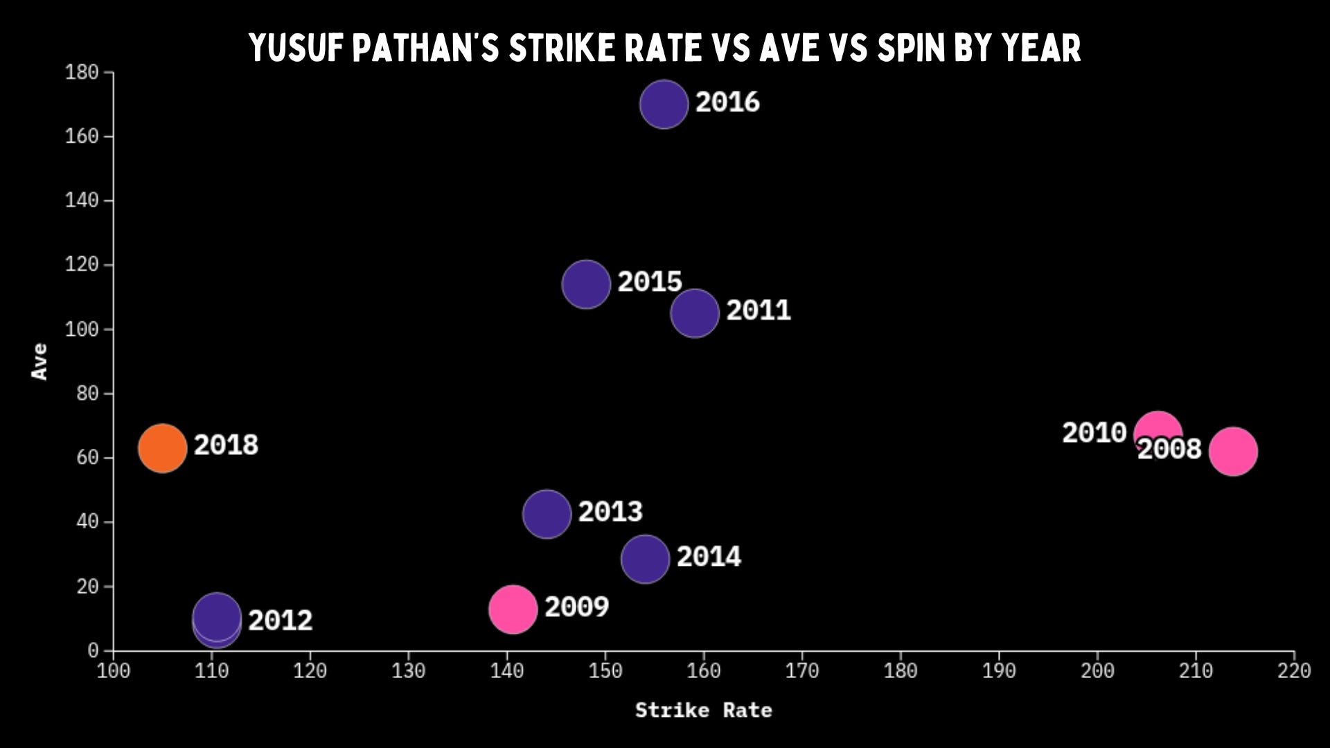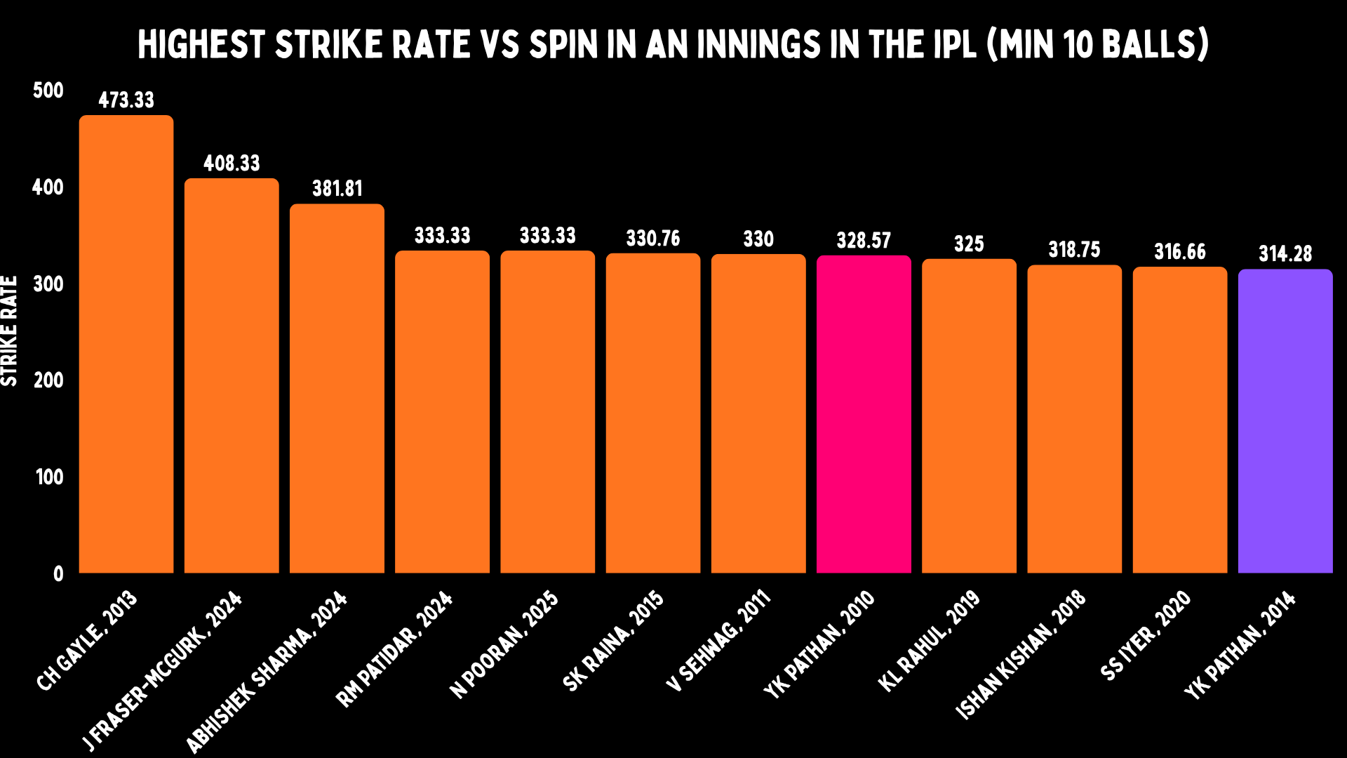That day, Yusuf Pathan hit 46 off 14 against spin. He did it again in 2014, making 44 off 14 against Sunrisers Hyderabad spinners en route a 72 off 22. Even now, he has two of the fastest knocks ever against spin in an innings.