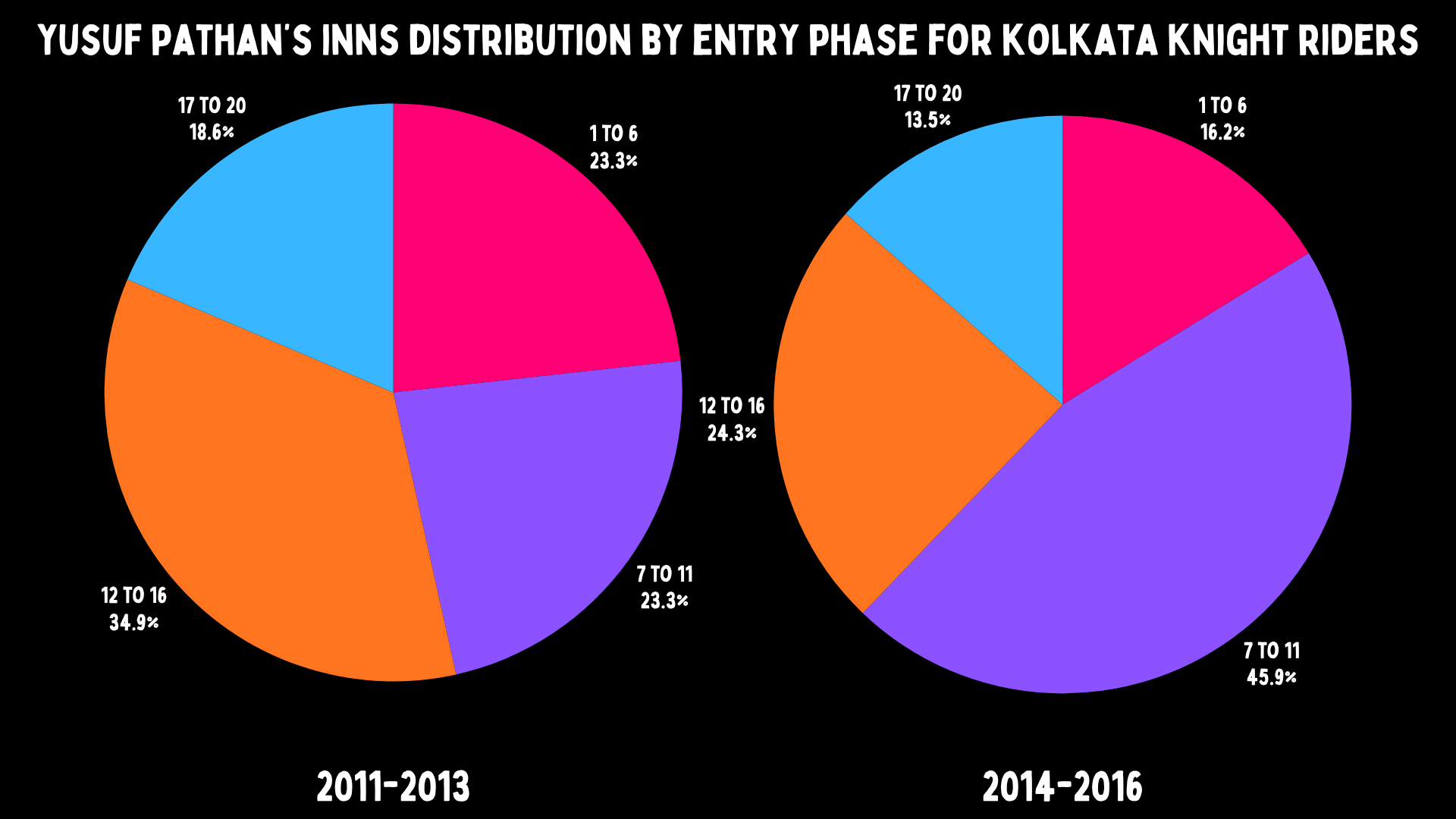 Changing sides muzzled him. The latest Yusuf ever entered for Rajasthan was the 15th over. For Kolkata, they didn’t see it that way. From 2011 to 2013, he was largely an afterthought, entering in his ideal phase just 23% of the time and frequently sent in at the death, where he was far less effective.