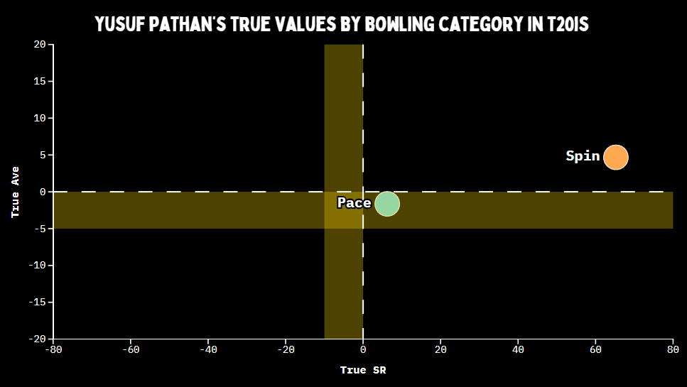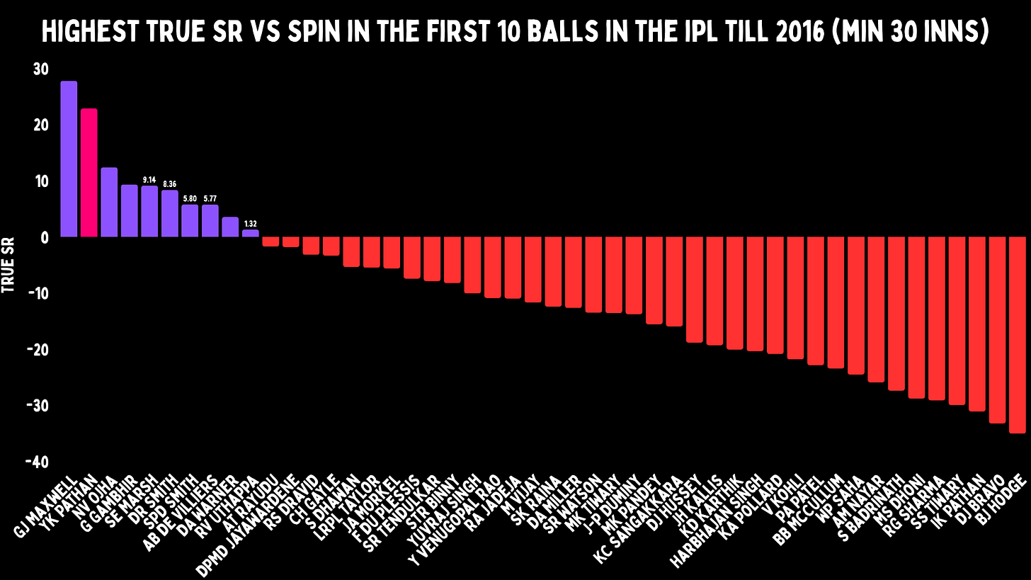 Yusuf didn’t need time to get going against spin, a rarity for batters. Only 10 players out of 48 have a positive true strike rate versus it in their first 10 balls. Yusuf with a true strike rate of 23 is only second to Glenn Maxwell’s 28. However, Yusuf’s true average in his first 10 balls is 20, whereas Maxwell’s is -11.