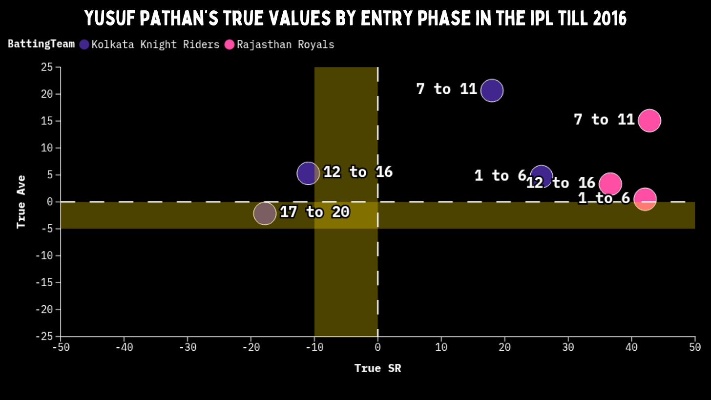 Yusuf had a true average of 15 and a true strike rate of 43 when he entered in that phase. He could face the matchup he loved from ball one, and as we’ve established, once set, nothing you bowl matters.