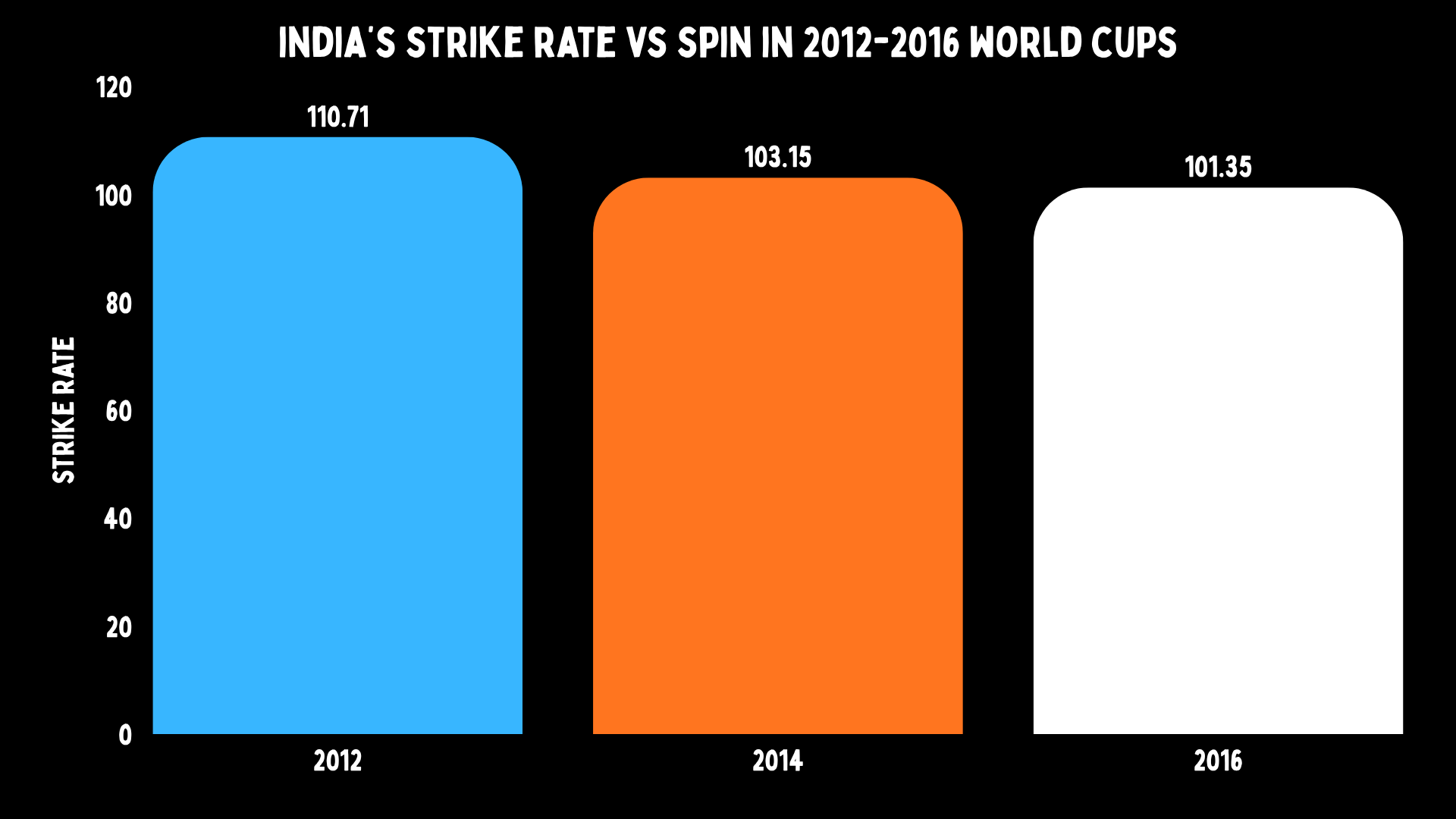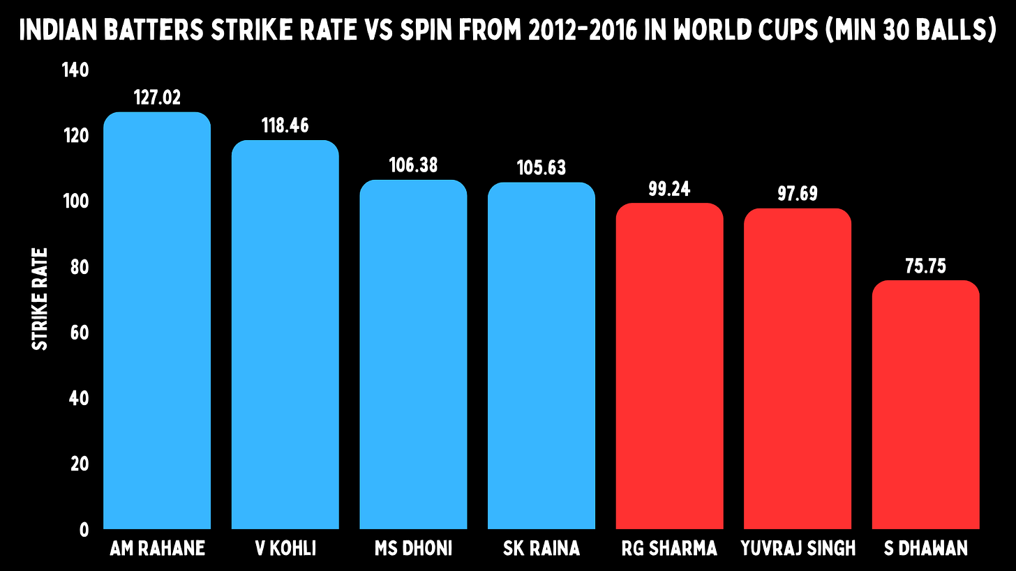 In these tournaments, where both playing and bowling spin would play a central part in determining your fate, India had strike rates of 111, 103 and 101. Barely over a run a ball in 2014 and 2016.