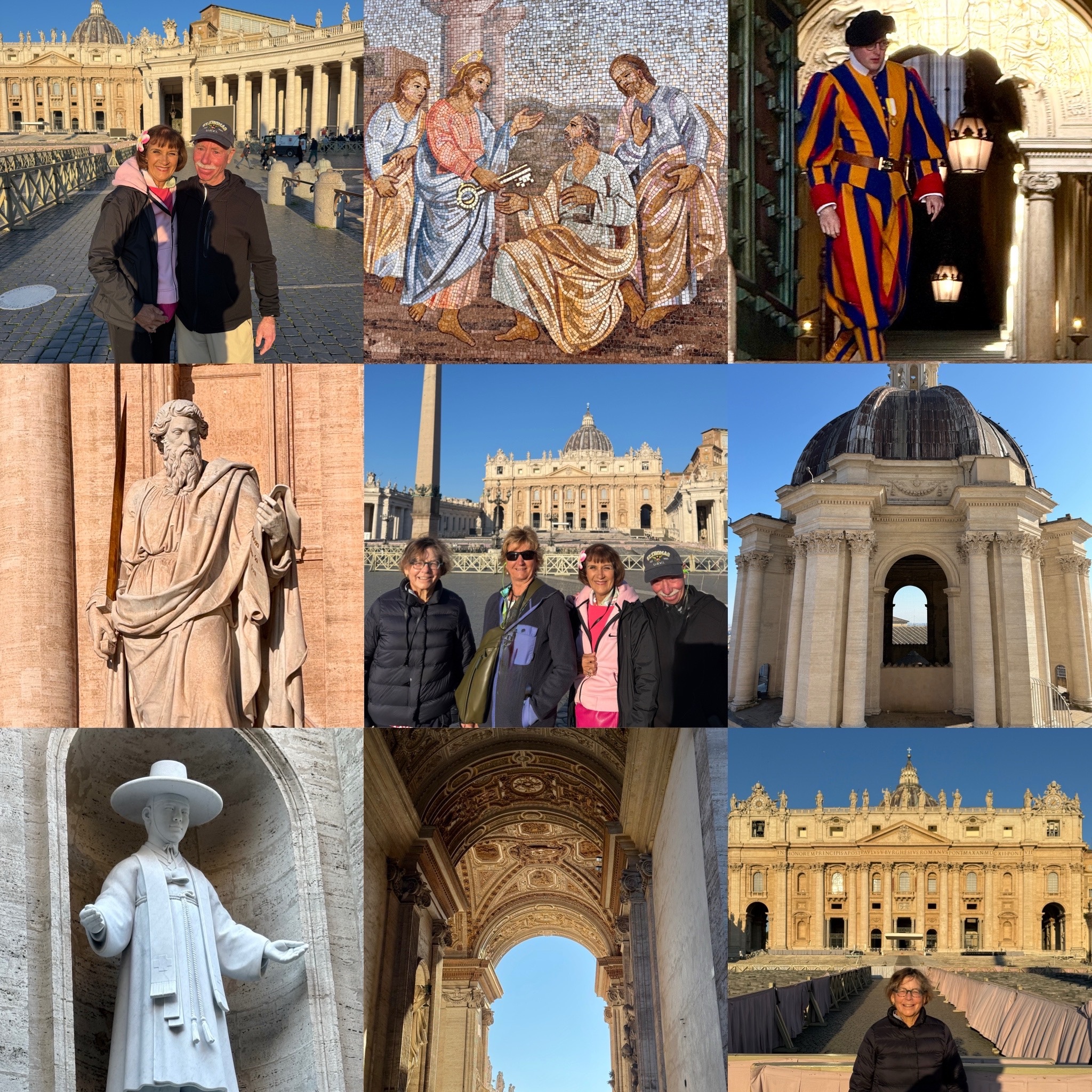 Tuesday we visited the smallest country in the world, Vatican City, with a population of under 1000 people (no children) and a size of around 100-110 acres In size it is about 1/8 the size of NYC’s Central Park; has no income tax, has a grocery store (only open to citizens of the Vatican), a post office. The Pope is protected by Swiss guards: males age 19-30, Christian, trained in the military and at least 5’8.5″ tall. They wear Renaissance era colorful striped uniforms (probably designed by Jules Repond and not by Michaelangelo) and free food and lodging (plus about $2000 a month). The official language of Vatican City is Latin. To become a citizen one must be appointed and ends when the appointment ends.