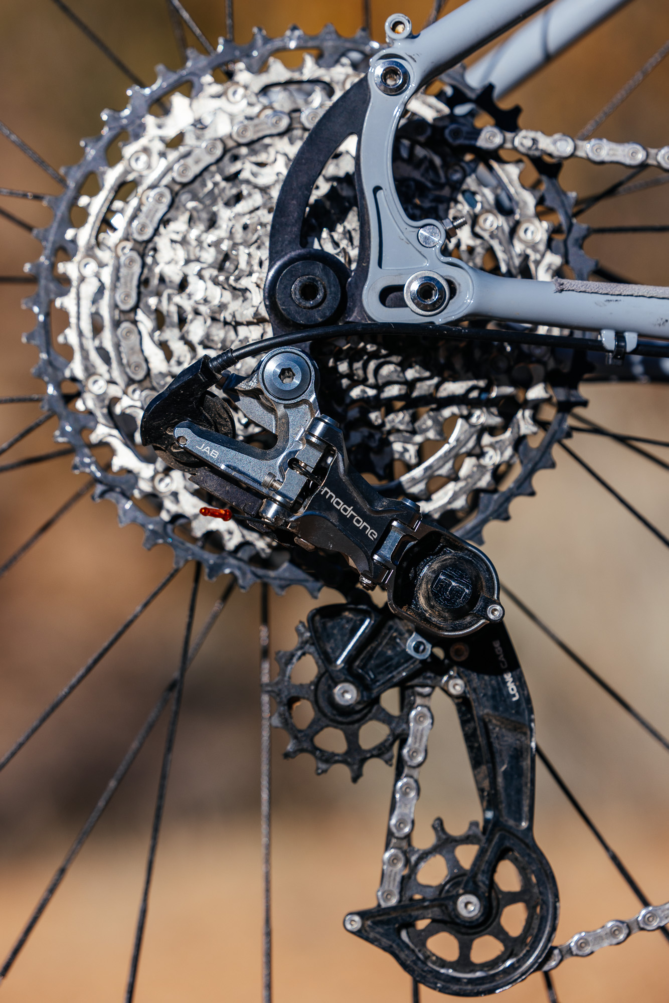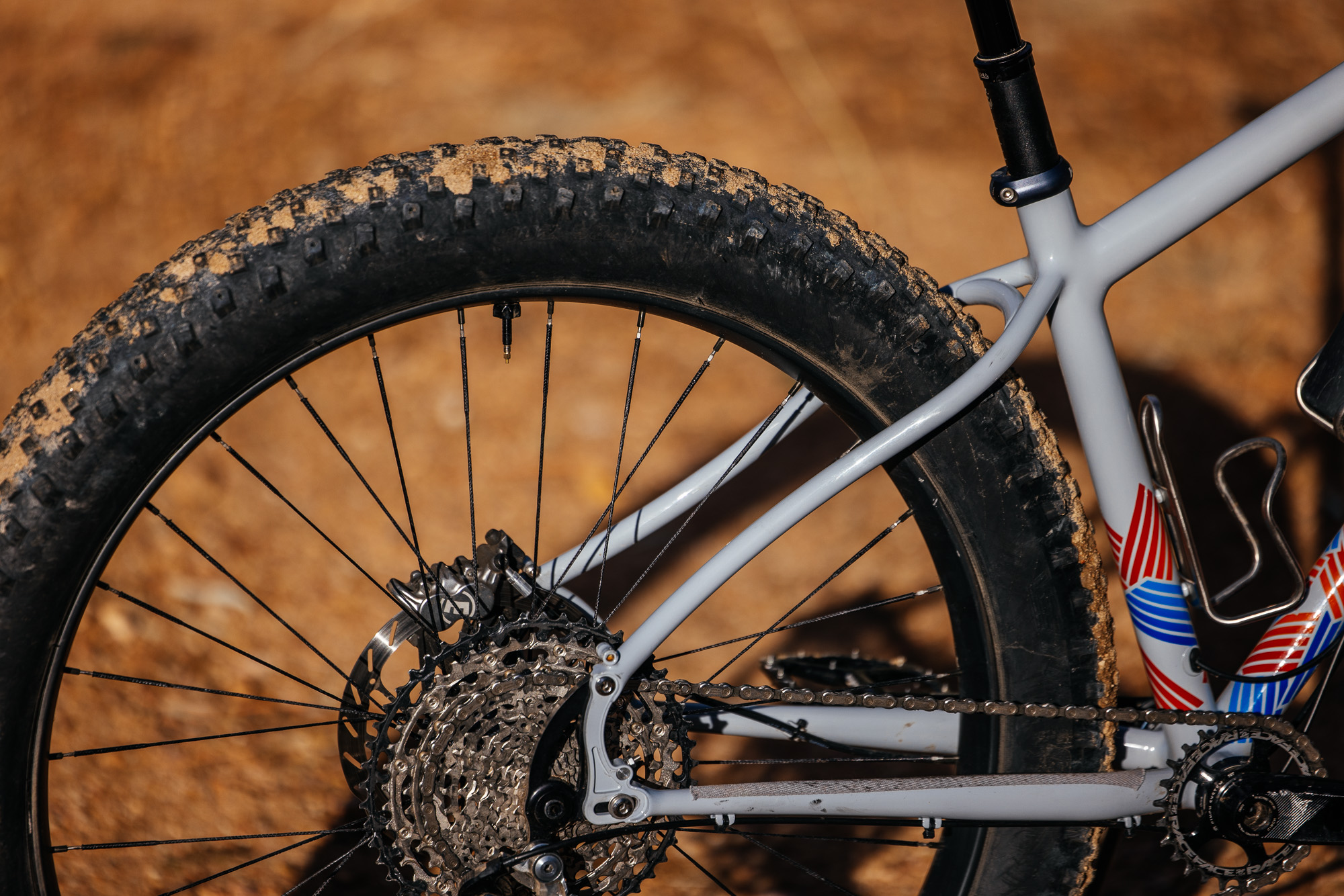 As for the drivetrain, I was super excited by the thoughtfulness, rebuildability, and brand-agnostic compatibility of the Madrone Jab derailleur. I went for my favorite tried-and-true Race Face Turbine cranks and one of their 26-tooth chainrings. I normally ride a 28-tooth ring on my other non-fat bikes because, as I mentioned in the intro, our trails are steep! Despite my best efforts, I continue to boldly age into my late 40s, and these grades aren’t getting any tamer, so I have no shame in proudly spinning that 26-tooth ring amidst a sea of (gasp!) 32-tooth front rings.