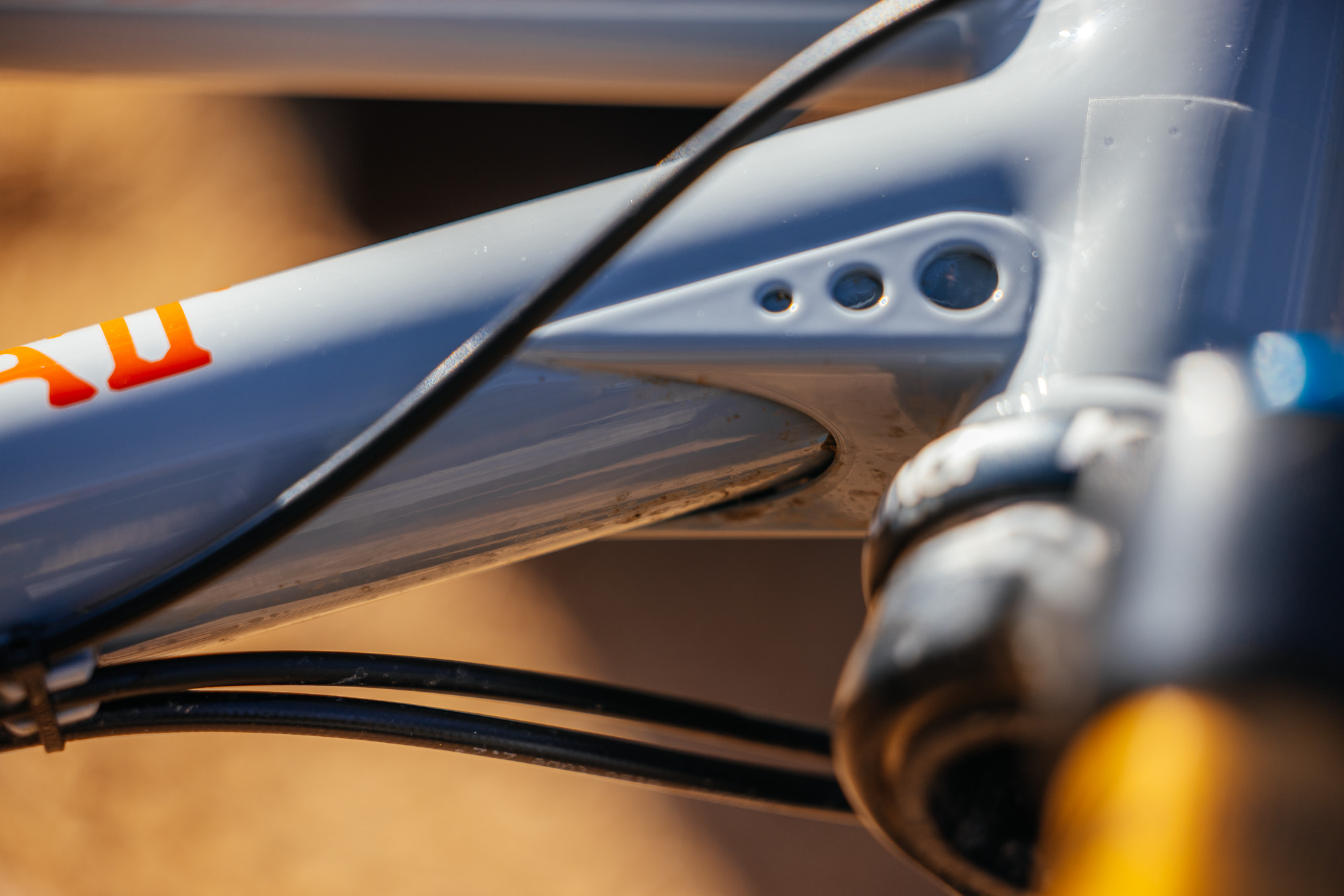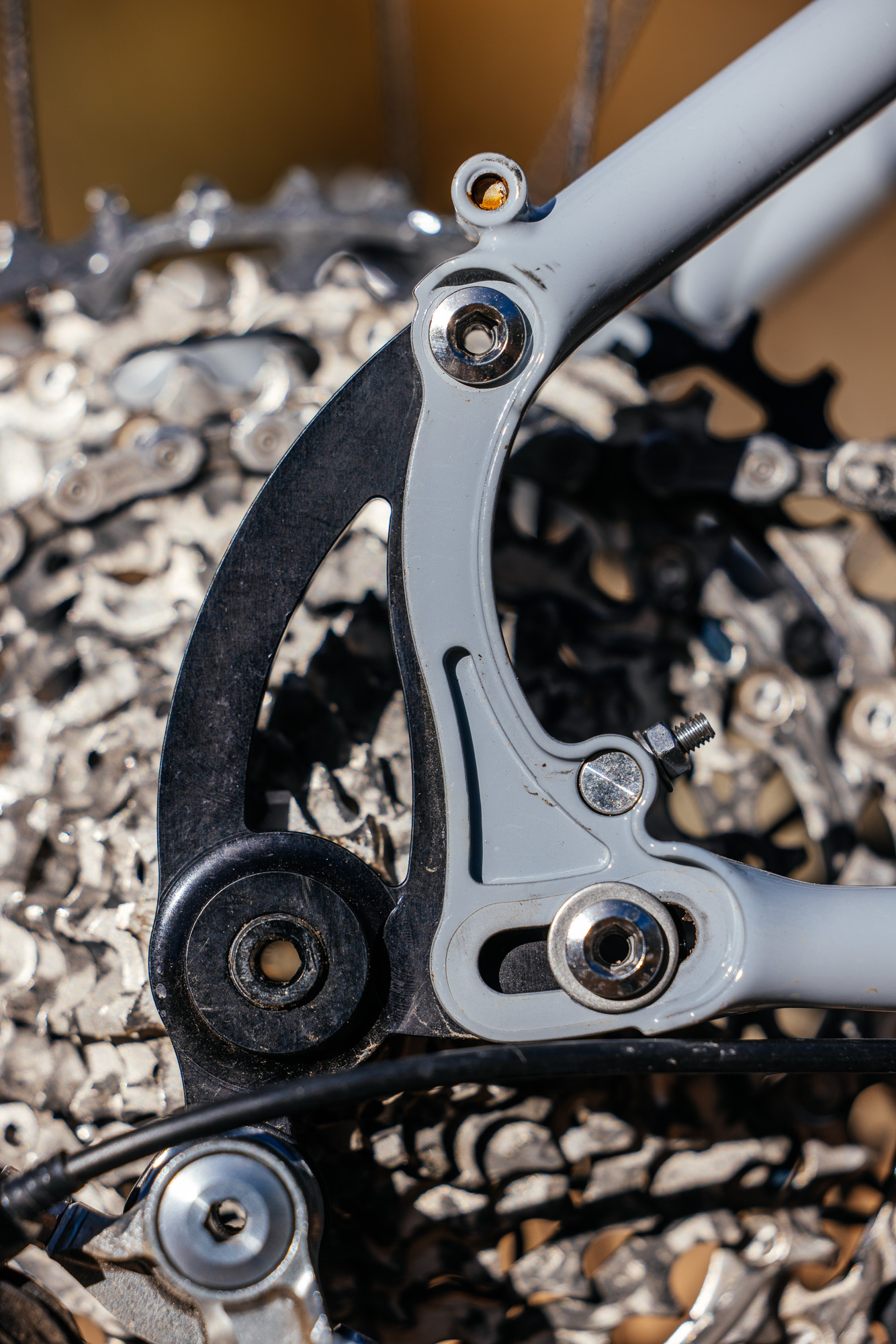 Finally, Todd designed a color-matched and equally unique rear rack, which is unfortunately not pictured in the photoset. This rack allows me to strap on a rear bag with room for three pack mounts on each side for extra cargo. It’s a fantastic addition for bikepacking, allowing me to get full use of my 200mm dropper without having a wagging seatpost bag bouncing around behind me. For mounting points, Todd included braze-ons by the dropouts and a clever hinged clamp that attaches around the bottom of the dropper post.