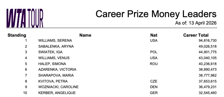 On the WTA side, Serena Williams remains the all-time leader with $94,816,730 in career earnings. Active players Aryna Sabalenka ($49,026,518) and Iga Swiatek (estimated $45-48 million) are climbing the ranks but still trail significantly behind Williams.