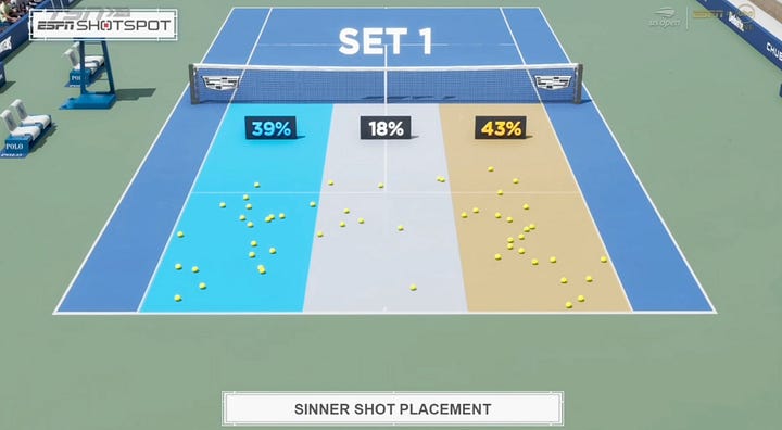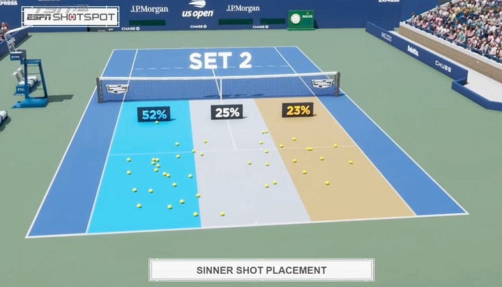 At an X’s and O’s level, the Italian made a subtle adjustment in his rally direction in the second set, hitting more balls into the Alcaraz backhand side, and using his backhand down-the-line as a means to attack the Alcaraz forehand when the Spaniard was caught on his ad-side mound; a pattern that featured prominently in his Wimbledon win.