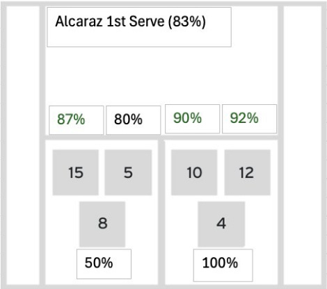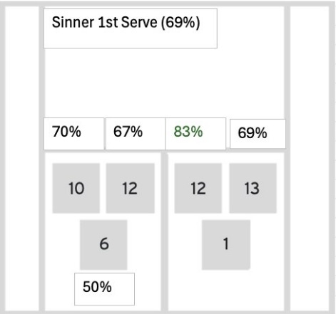 Alcaraz dominated the forehand, hitting 14 drive winners to Sinner’s five. And somewhat related to that, the Ad-side service points were literally untouchable for the Spaniard, winning 24/26 first-serve points: