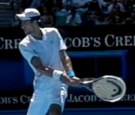 If I may put on my technical hat and get hyper critical of the Sinner game, I think a small chink in his armour his how much racquet drop he gets on return-of-serves. I think this particularly makes it a little harder for him to take on second serves early and guide the ball with the kind of flat aggression that results in Alcaraz doing crush-and-rush, or Djokovic hitting both corners at will from inside the baseline. Let’s look how linear the Djokovic return is: the racquet head only ever drops to level with the hands before getting pulled forward to contact: