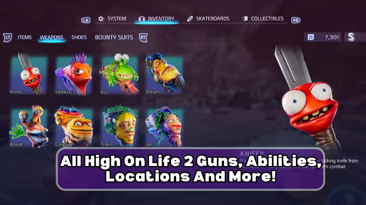 There are a total of 7 weapons to use in High On Life 2. Six, if you don’t count your melee buddy Knifey, who makes his return, but who would ever do that. The guns that make their return in this sequel are Gus, played by JB Smoove, Sweezy, voiced by Betsy Sodaro, and Creature, played by Tim Robinson. All of the weapons can be and will be earned as you progress through the main story. So no worries about missing any of these iconic characters.