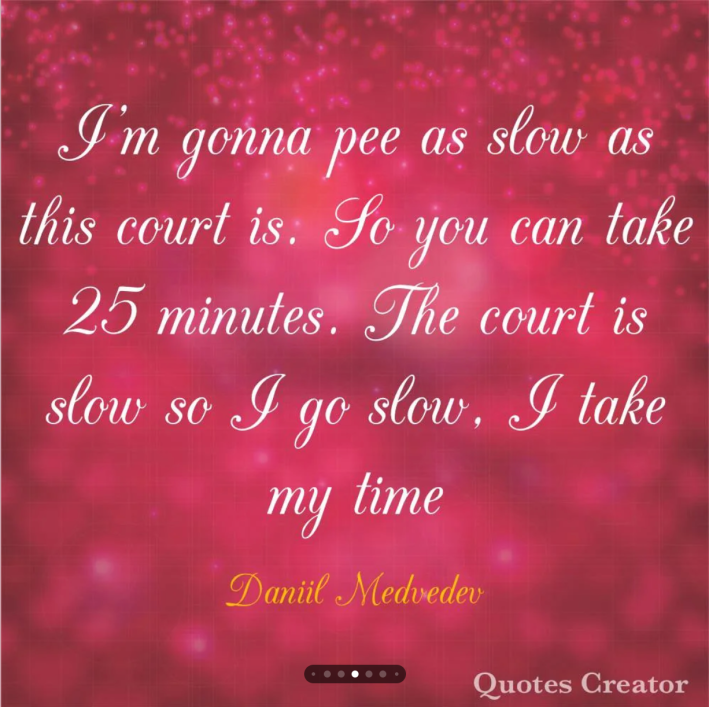 What I hear, Daniil, is a resistance to rhyme and a suffocation of reason. Could it be that you are spiritual? Because damn, your words sound awfully like letting go and letting G*d. We normals nodded along emphatically. Meddy, he’s just like us! I am intimately familiar with playing excellently one day; all the while knowing that excellence is a harbinger of reprehensible tennis to come the next time I step onto the court.