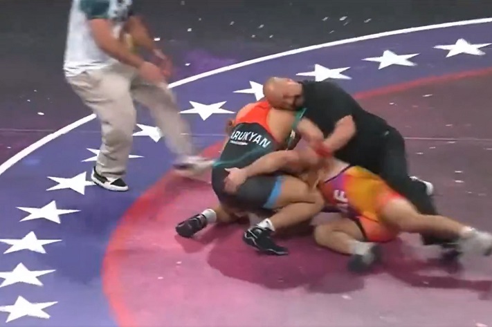 Tsarukyan was matched up with Georgio Poullas at the event in Tempe, Arizona on Saturday. Poullas was clearly losing the match, and started clubbing Tsarukyan at one point, possibly looking for a DQ. That wasn’t forthcoming, and Arman waited until the match was over, then shoved Poullas and went after him with an elbow and punches.