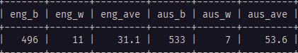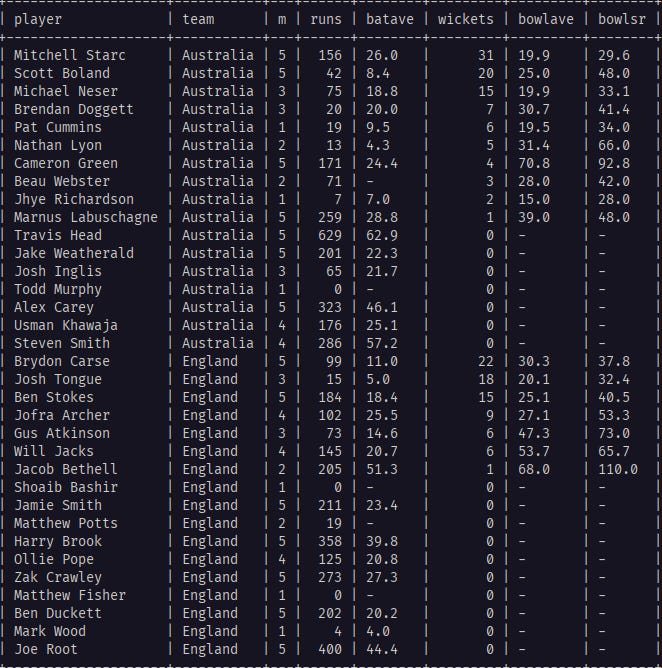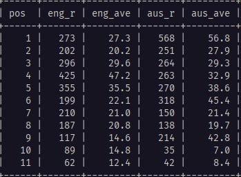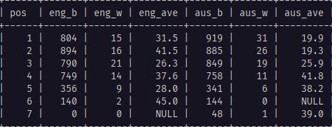 The figures for each bowling position suggest that England’s spare bowlers (bowlers in positions 5 or later) outdid Australia’s. They did, thanks to Stokes’ five wicket haul (as the 5th bowler) in the first innings of the series. After that, England’s fifth bowlers managed six wickets in four Tests. As the figures also show, England four main bowlers needed more support than Australia’s four main bowlers did. But England’s fifth bowler bowled roughly the same number of overs as Australia’s fifth bowlers.