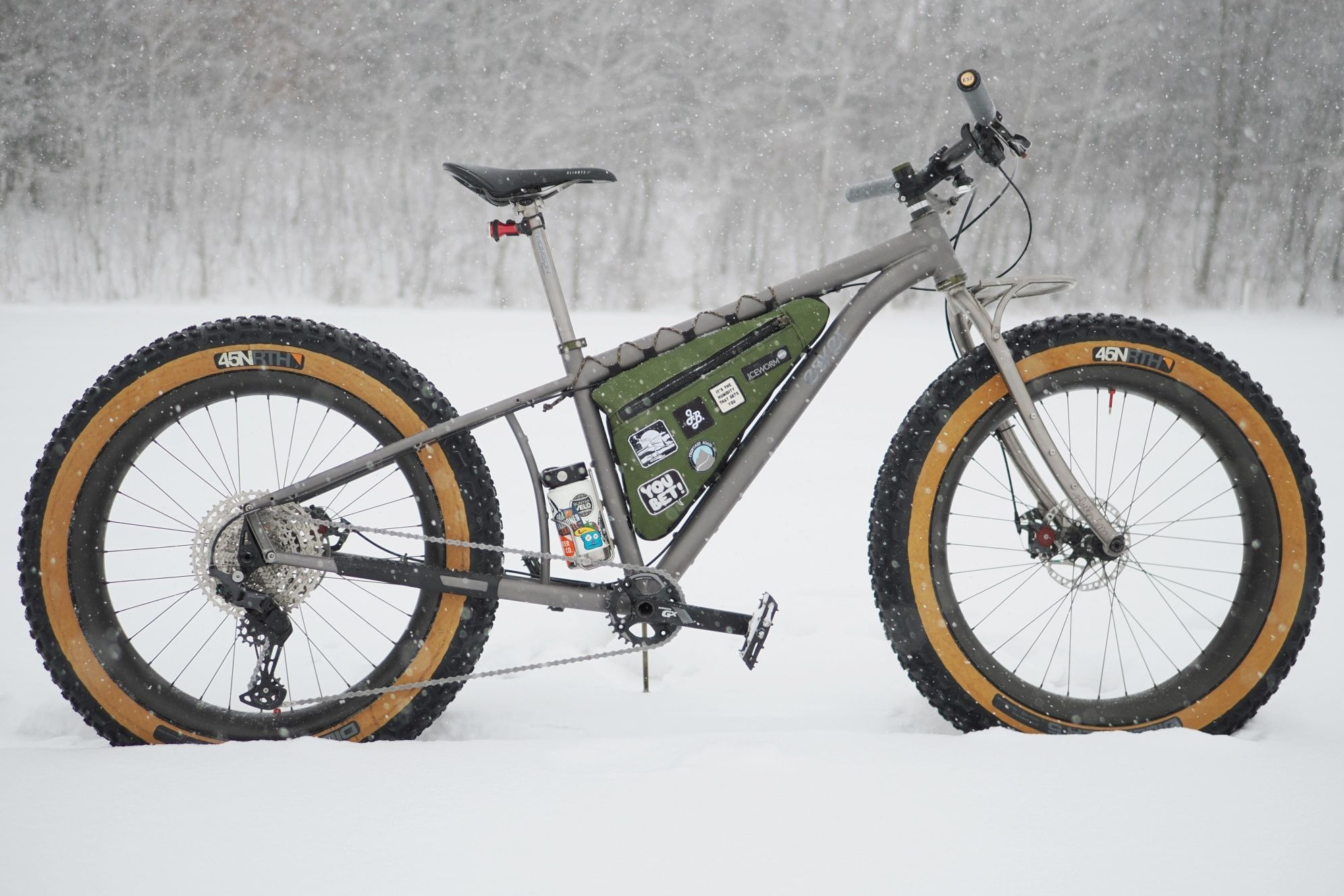 Planning for a tour to the Atacama, or even just in the sandy washes of Utah’s Canyon Country? Hell, or riding down a river in Utah’s Canyon Country? Praying for snow delivered this year, and you can finally do that hut to hut you’ve been eyeing in Maine? Or maybe you just like it fat. Esker Cycles took everything everyone loved – ourselves included – about the Hayduke LVS and fattened it up for sand and snow, creating the behemoth Hayduke LVS FAT. It’s loaded with cargo bosses. The Hayduke LVS FAT comes with 30 attachment points for adventure accessories, and M6 threaded rack mounts built into the frame for the attachment of Molle Rackwald, Esker’s proprietary direct-fit rack.