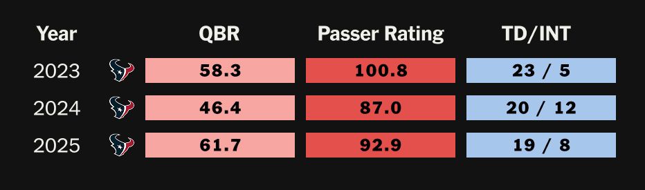 On the other hand, Houston’s been … well, really good. In the three seasons prior to drafting him No. 2, the Texans went a combined 11-38-1. They’re since 32-19 with three consecutive playoff appearances under DeMeco Ryans. How much do you credit Stroud for that?
