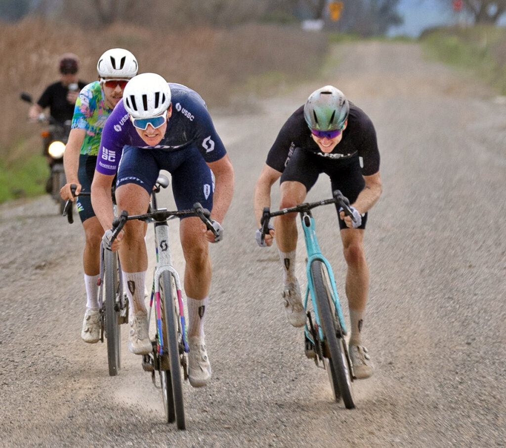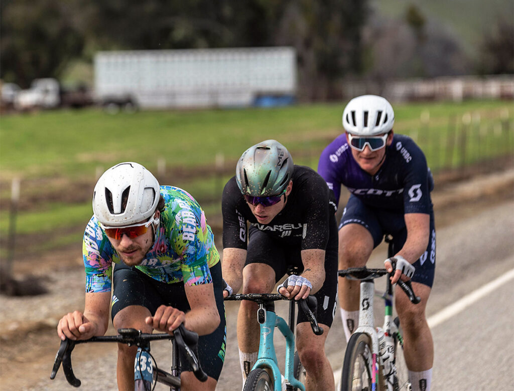 Marcis and I both attacked on this final climb, and we dropped the other two, but not Skyler. On the descent, Marcis was willing to risk a bit more than I was, and he got a small gap on Skyler and me. But this was all working out exactly to plan. Skyler and I rotated calmly to chase back to Marcis. We let him dangle a bit ahead of us, where he was hopefully burning more energy than would have been necessary if he’d stayed with the break. Eventually, we caught him and resumed rotating smoothly. As we approached the finish, I tried an attack with about 5 km to go, but I could tell that the other two were too strong for me to get away. I realized that it would come down to a sprint.