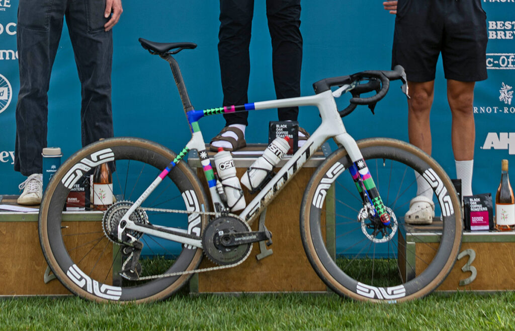 My setup for the Huffmaster Hopper worked really well. I opted for my Scott Addict Gravel with Rene Herse 38 mm Barlow Pass Endurance tires at 33 / 34 psi (2.28 / 2.34 bar). I have run the 35 mm Bon Jon Pass Endurance tires the last few years here, but I knew the course was in a bit rougher shape from all the recent rain. I decided to go up one size for this year’s edition. I’m glad I did—my setup was absolutely perfect!