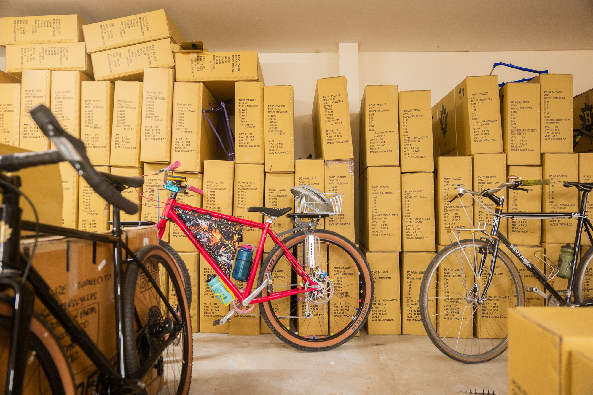 I met up with the two brothers at their HQ at Brogdale Farm, home to the National Fruit Collection, which has over 3,500 varieties of fruit trees, with a strong focus on apples and cider production. Their warehouse used to be a butcher’s cold store, so it has a lower ceiling than you’d imagine for a warehouse, with more of a garage vibe. It’s filled with boxed frames ready for shipping, a little workshop for assembling bikes, and a slew of toys of varying sizes thrown into the mix. There’s a motorbike, a car engine, and shelves filled with RC cars. I’d come with the idea of recording some sound, so we built a box fort in one corner out of stock and sat down there. Will looked a little shifty at the beginning because he’d seen a cat-sized spider in that corner a week before, but once we’d settled in, it was quite comfortable and sounded great.