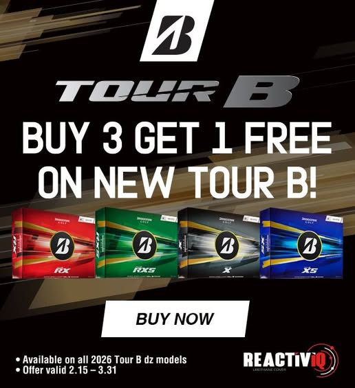 Buy 3, Get 1 FREE on the Bridgestone Tour B golf balls. Dour models designed for distance, feel, and control, now through March 31st, 2026 at Haggin Oaks.