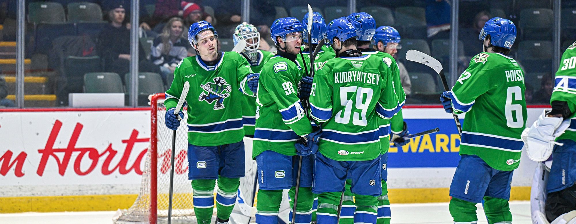 The teams exchanged time in the penalty box through the rest of the period, but Abbotsford’s defense remained locked in. Ty Young was stellar in net, recording his first career AHL shutout with 23 saves, leading the Canucks to a 4-0 victory over the Colorado Eagles.
