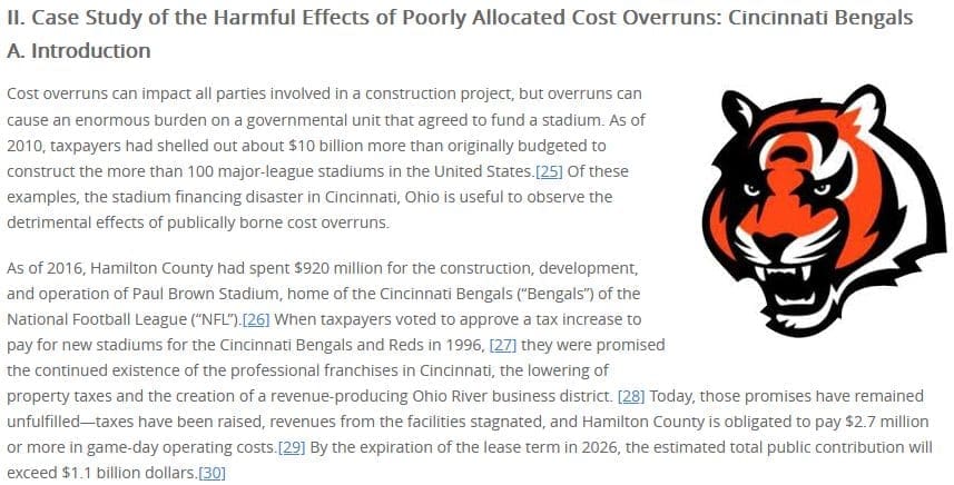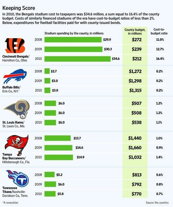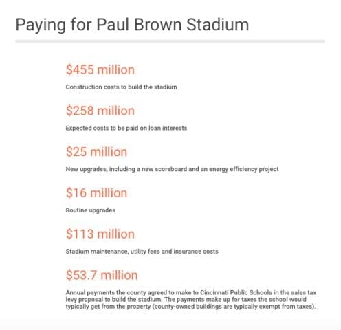 “Paul Brown Stadium, the home of the Cincinnati Bengals, is the result of the most fiscally disastrous stadium deal in American history. The stadium cost more than double its initial projections, and wound up crippling Hamilton County’s budget. In 2008, Paul Brown Stadium debt accounted for 11 percent of the county’s general fund. In 2010, it was 16.4 percent. It is a fiasco.” — Vice, 2015