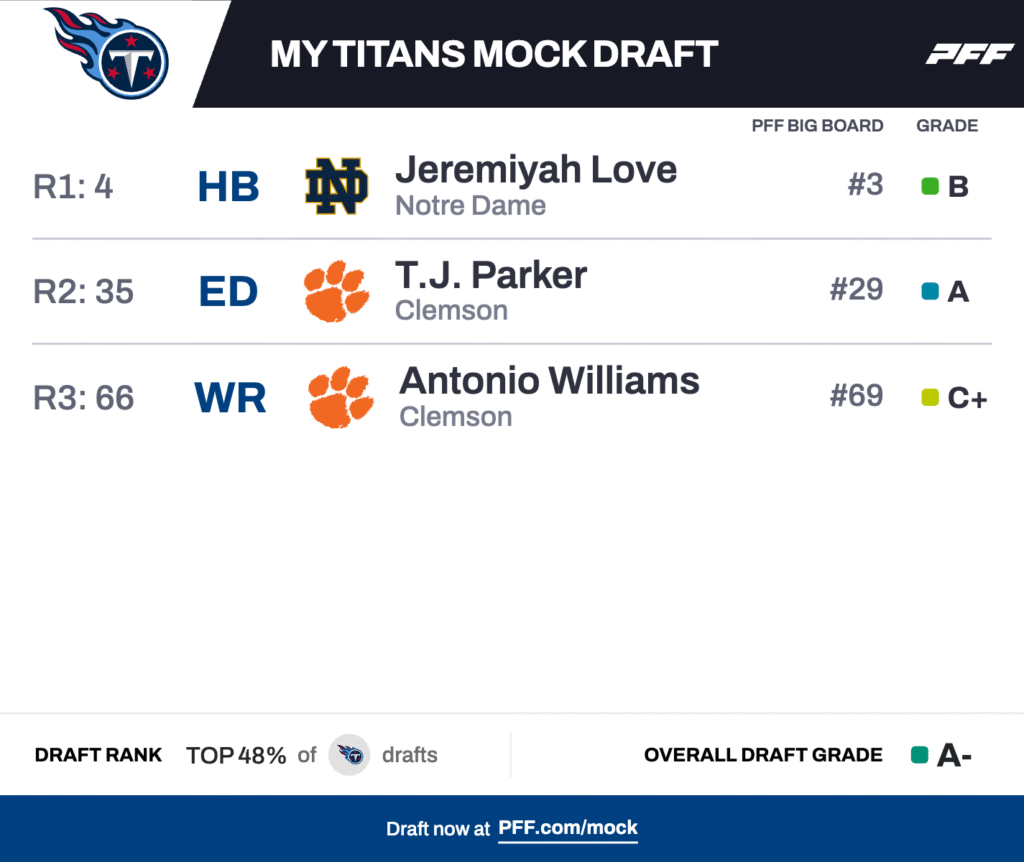 New head coach Robert Saleh could bang the drum for a defensive playmaker like Rueben Bain Jr., but Love’s all-around talent — with a 93.7 PFF rushing and 72.6 PFF receiving grades — are too much to pass up. The blue-chip weapon offers Cameron Ward more firepower in his second campaign, especially after Tony Pollard ranked 25th among qualified rushers in rushing grade in 2025. Tennessee makes the most sense for Love based on both the team’s draft slot and roster profile considering general manager Mike Borgonzi’s defensive investments this spring.