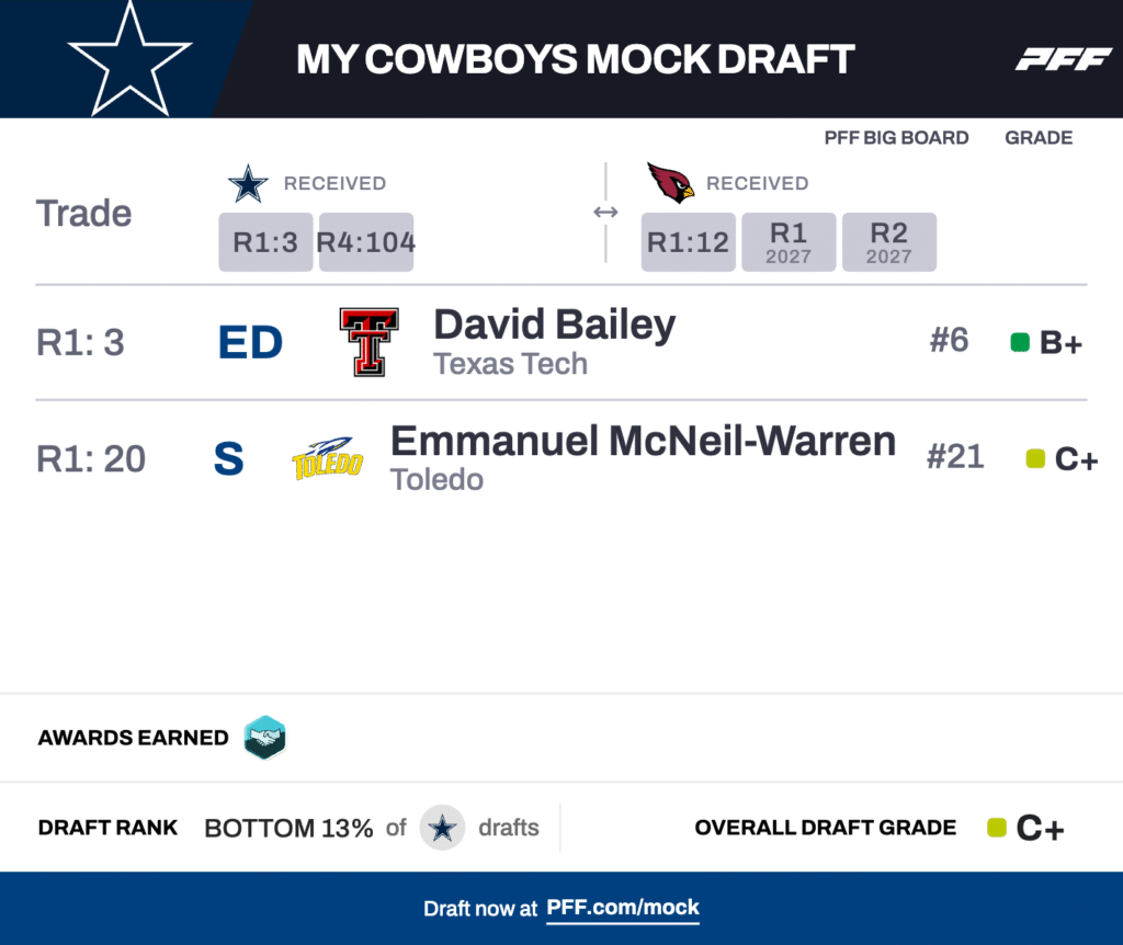 - The Cowboys make a splash for David Bailey: Holding multiple first-round picks in each of the next two years, Dallas comes up to get its in-state star edge rusher.