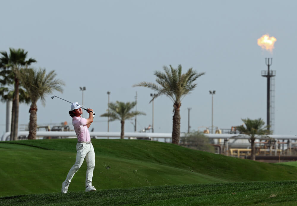 Oil production looms large behind Freddy Schott at the 2026 Bahrain Championship on Feb. 1. Warren Little, Getty Images