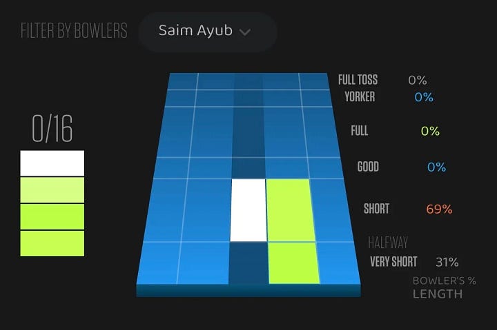 The ESPN pitch map for Ayub’s 13 balls to Kishan indicates that they were all either short (69%) or pulled even further back (31%). Ayub found a line and length that stifled Kishan, and he stuck to it with massive success.