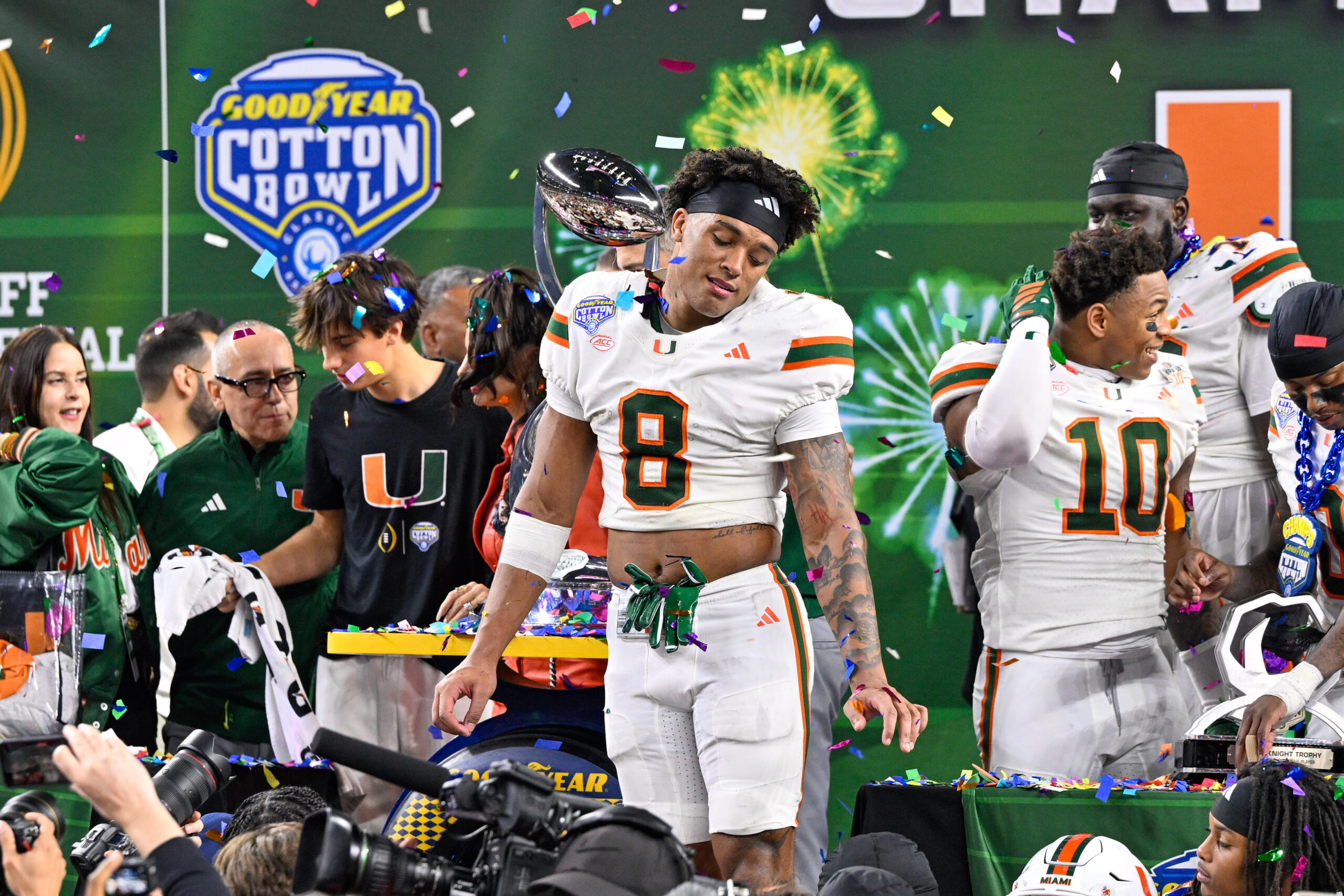 Dec 31, 2025; Arlington, TX, USA; Miami Hurricanes defensive back Jakobe Thomas (8) celebrates after the 2025 Cotton Bowl and quarterfinal game of the College Football Playoff at AT&T Stadium. Mandatory Credit: Jerome Miron-Imagn Images