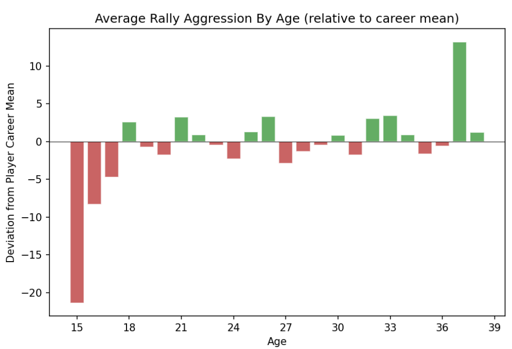 From age 18 to 36–the entirety of most players’ careers–there’s nothing to see here. Plus or minus five points of rally aggression score is a rounding error, especially since these are non-random samples based on what Match Charting Project contributors wanted to chart and could find on video.