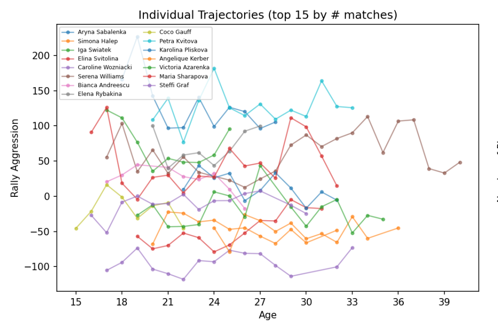 There are exceptions, of course. Maria Sharapova’s highest single-season aggression score was in 2004, when she was 17. Madison Keys arrived on the circuit playing essentially the same game she would play for the next decade. Iga Swiatek was more aggressive at age 18 than she has been since.