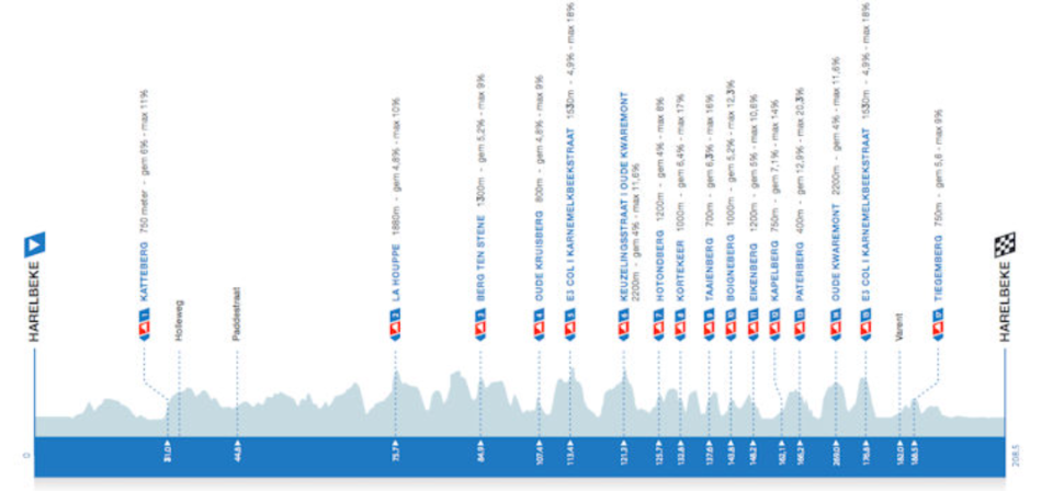 The first ascent of the Oude Kwaremont comes after 121km, just after the debut of E3-Col and will be scaled in an unused direction via Keuzelingstraat. The race heads over the likes of the Taainberg and Eikenberg before encountering the Paterberg and Oude Kwaremont duo in the final 42km. From there, it’s once again over the E3-Col as the last climb of the day of the Tiegemberg comes with 20km remaining.