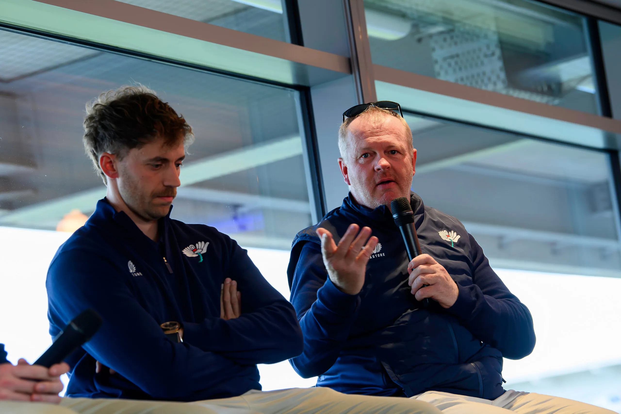 Picture by Allan McKenzie/SWpix.com – 25/03/2026 – Cricket – Yorkshire County Cricket Club Opening Season Lunch – Headingley Cricket Ground, Leeds, England – Compere Oli Bell with players Dom Bess & Jonny Bairstow.