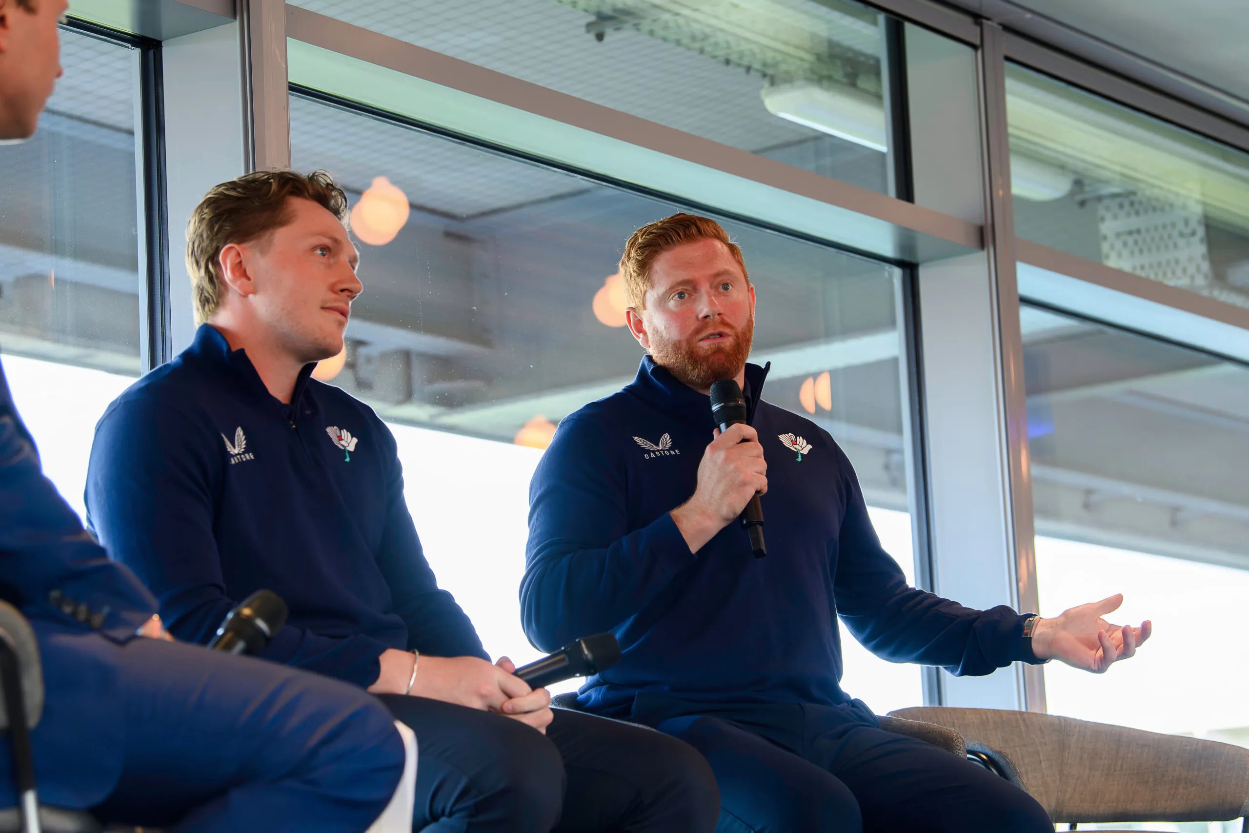 Picture by Allan McKenzie/SWpix.com – 25/03/2026 – Cricket – Yorkshire County Cricket Club Opening Season Lunch – Headingley Cricket Ground, Leeds, England – Compere Oli Bell with players Dom Bess & Jonny Bairstow.